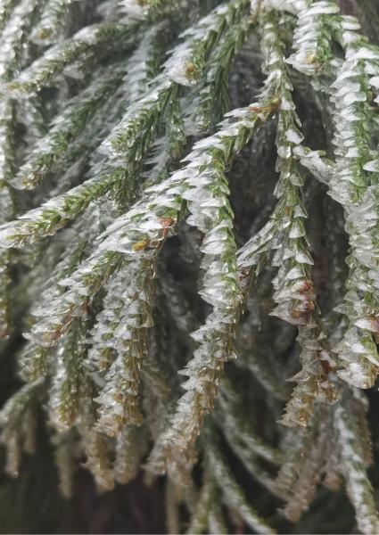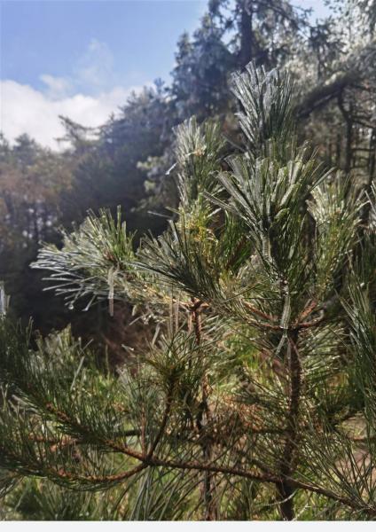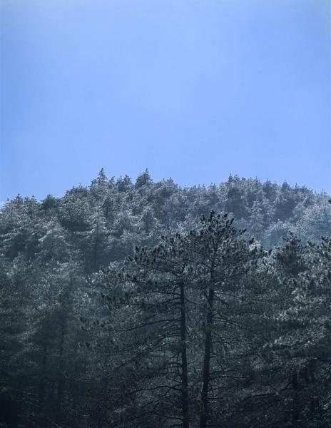 远处,山顶成片的松柏绽银菊,冰羽晶莹,这是一份冬的留恋!