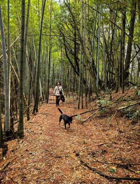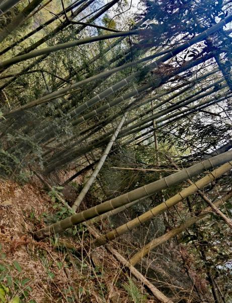 然后就是难行的路了,倒下的竹子树枝横在路上障碍颇多 下山的路途更加考验人的耐心与谨慎。每一步都需小心翼翼,仿佛在刀尖上行走。脚下的碎石和松动的泥土让人不敢有丝毫大意,稍有不慎便可能滑倒。双手紧紧抓住身旁的岩石或树枝,借以稳住身体。