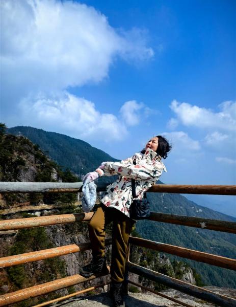 头发在风中飘舞,感受着暖意浓郁的山风