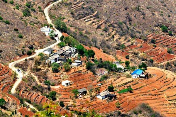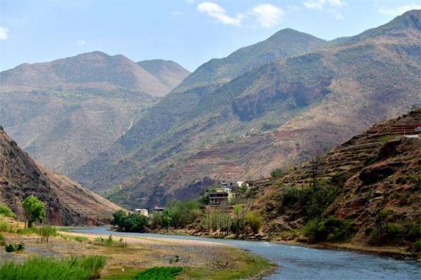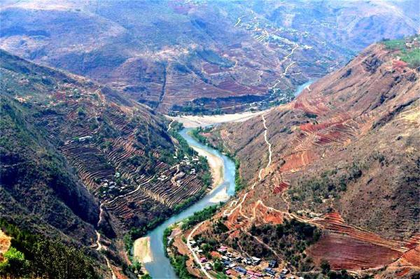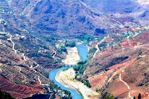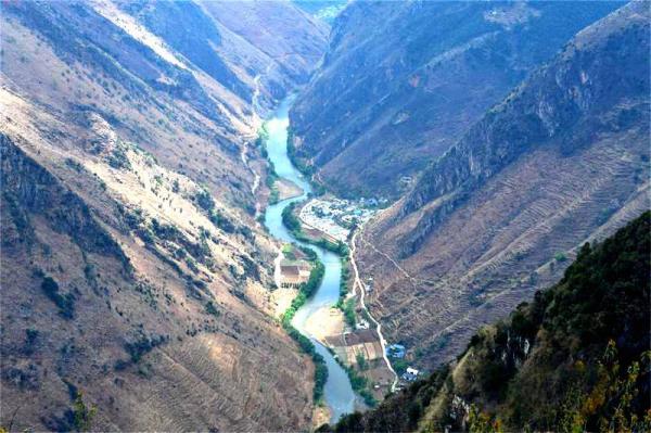 从远处观看这个紧邻江水的小村落,顺流而下的江水突然转弯,刚好留出一个空间让人们能在这里寄居、劳作,仿佛河水都在为它的存在而让道,这里缤纷的自然色彩与远山绝壁、沿岸的小村落交相辉映,宛如一幅幅美丽的画卷;