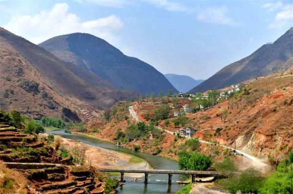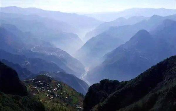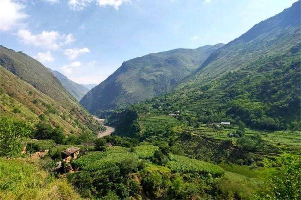 江水流经的最后一个村落现隶属二关营村,它接壤贵州省毕节市威宁县海拉镇,从山顶沿着道路而下,你能看到层峰叠嶂的山林交叉着蓝绿色的江水,中间交织着层次分明的土地和蜿蜒崎岖的道路,再点缀着几处白的、灰的、红的、蓝顶的房屋,拍上一张照片,宛如画上去的景色一样那么不真实;