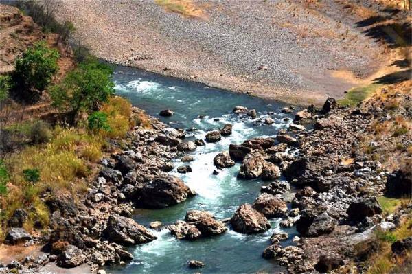 顺着江水向下游走去,有一片适合小憩的“乐园”,这里有长满芦苇和树枝的沙滩、有天然形成形色各异的石头,这里的河水清澈见底,水流拍打在石头上的浪花在墨绿色的水面上显得格外白皙,这片沙滩像一条小鱼一样奋力向前游动,换个角度,它又如同一个爱心将自己定格在河中间,而这条像蓝色的绸带一样的江水,蜿蜒曲折地飘落在大地上,被两边的大山夹击着流向那看不见的远方;