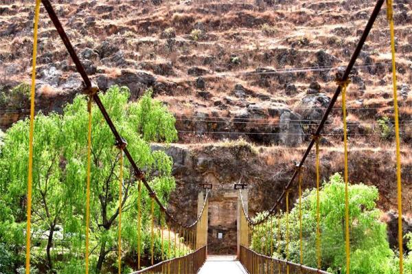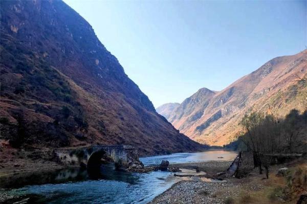 顺江而下的另外一个村庄是格核米村的新桥小组,村口的石桥就叫新桥(又名友谊桥),据相关资料显示,它始建于1810年(清嘉庆15年),由东南向西北横跨牛栏江,桥长84.5米,由桥墩、单孔古拱桥和铁索桥三部分组成,但因历史原因被炸毁,后又因江水猛涨、上游泄洪等原因,导致20多米的铁索栏被卷走,现在能看到的仅是一半的桥墩和简易的木桥,只能在水位较低的时候方便两边村民走动;