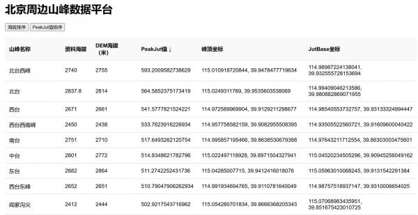 1.周三,181将Kai Xu提出的山峰视觉震撼程度量化指标“Jut”引入至北京周边地区,利用Claude的强大编程能力与Google Earth Engine的强大云计算能力,改进peakjut.com网站山峰数据量严重不足的痛点,得到了北京周边数百座山峰的Jut值和Jutbase点坐标,发现在现有数据里最高PeakJut值的是北台西峰(Jut=593.2009582738629),而北京现有PeakJut前十名是铁角山、水峪东大尖、刘财坨、大坨(南石洋)、上寺岭、东歧山、百花山菩萨顶、茶楼顶、东灵山和灰金坨,未来该数据可能在功能继续完善后将上线在网站或github项目中供走友查看。