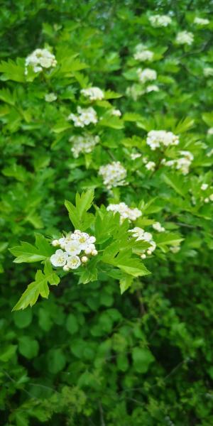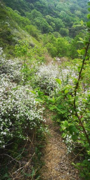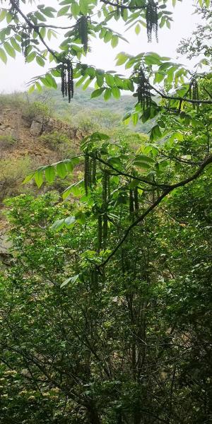 在这里碰到第二拨(两个)人,从阳台上下来向北继续。我一个人继续走向西的绕山小路。路旁到处是开白花的溲疏,高处核桃穗花挂满枝头。