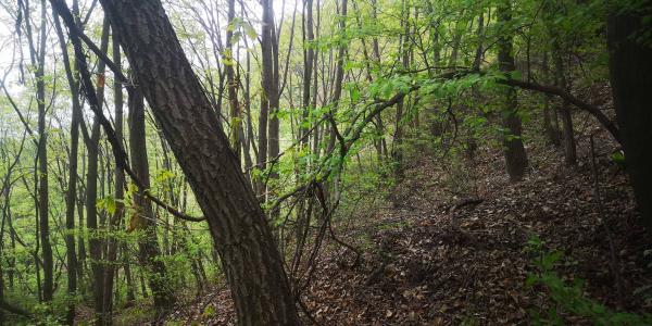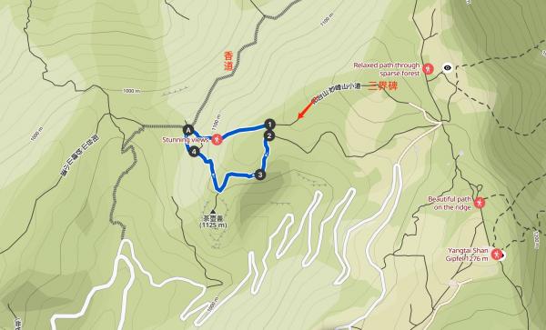 上到主山脊,有岔路北通凤凰岭,南上阳台山,继续向西绕山路是香道正路,我选择继续向西。这里的南北路是跑山者踩出的大路,西去香道反而在此消失,变成小土路。