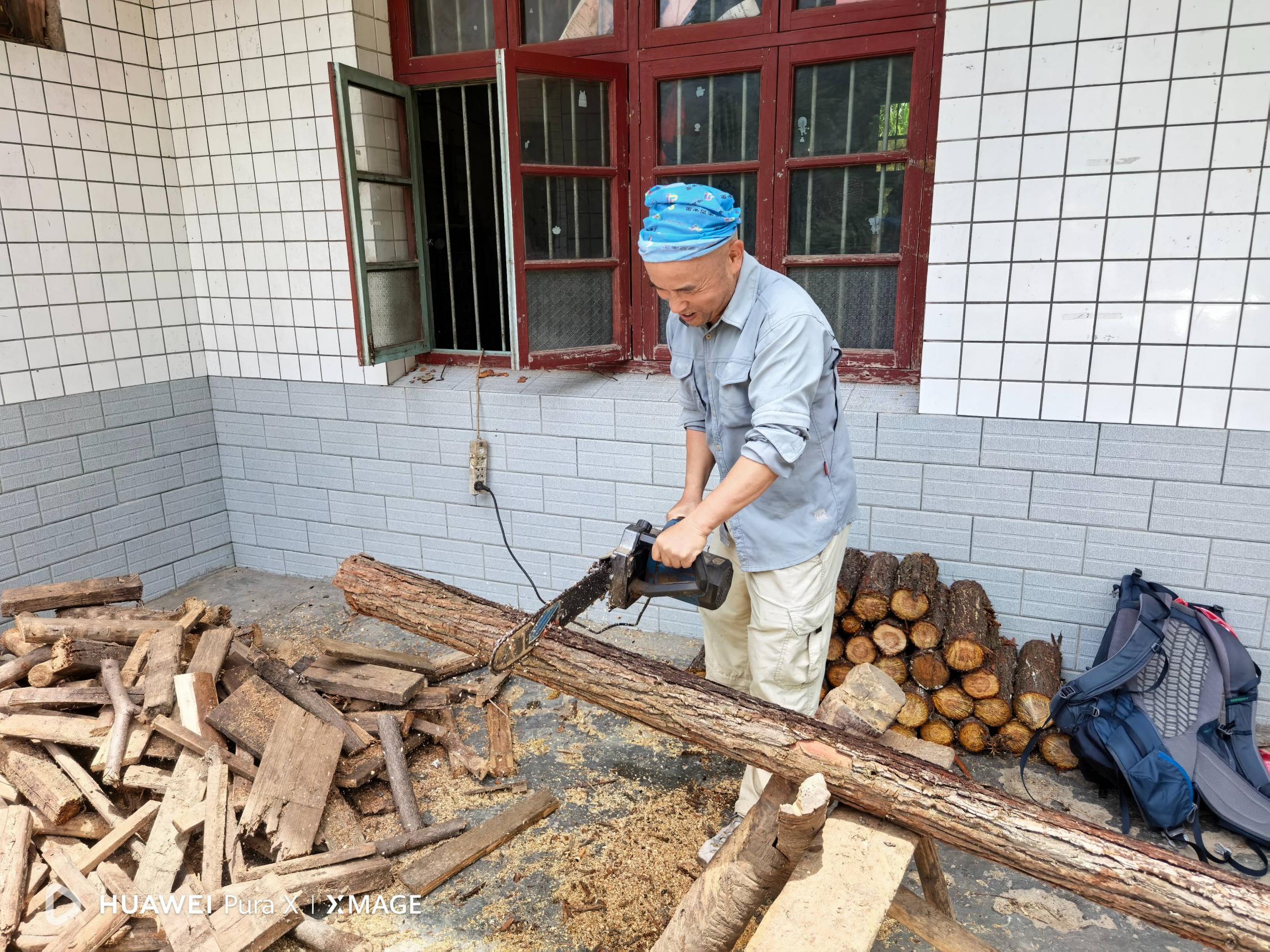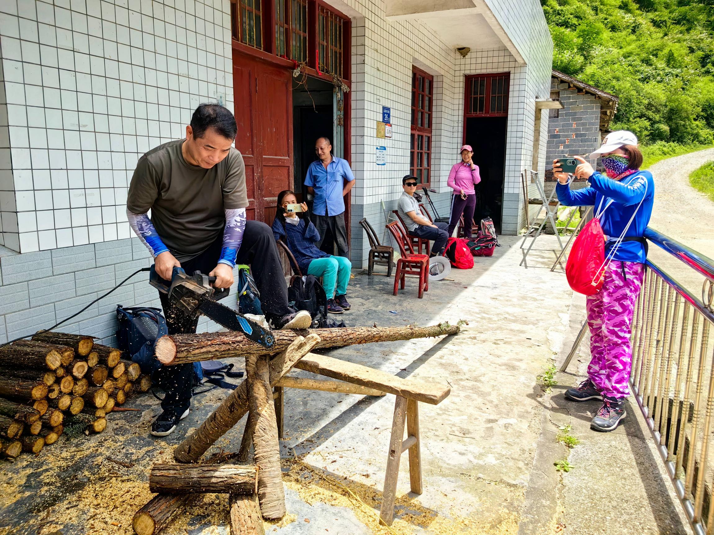 13点,到第二休息点。老乡客气,让上树摘桃子,啊混老师/水牛老师,还体验了一把现代化“伐木”,叫“伐柴”更合适。