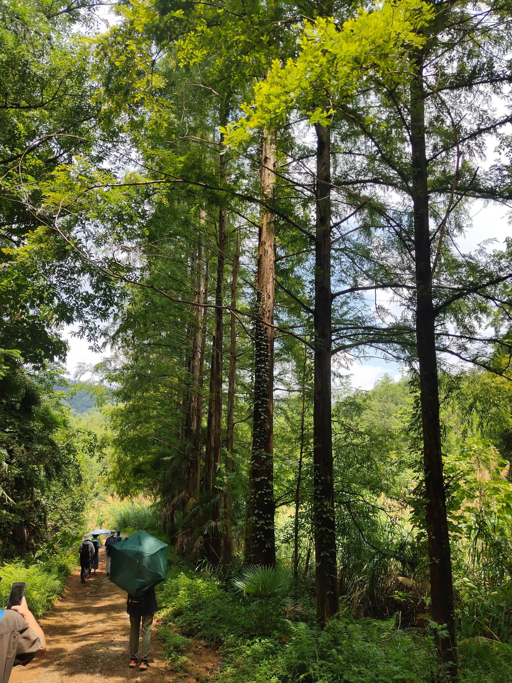 原始森林秘境已成简易公路大道,路边二层小楼已放弃,前进少许,左边下坡一排笔挺水杉林立,指引我们到达金盆水库。