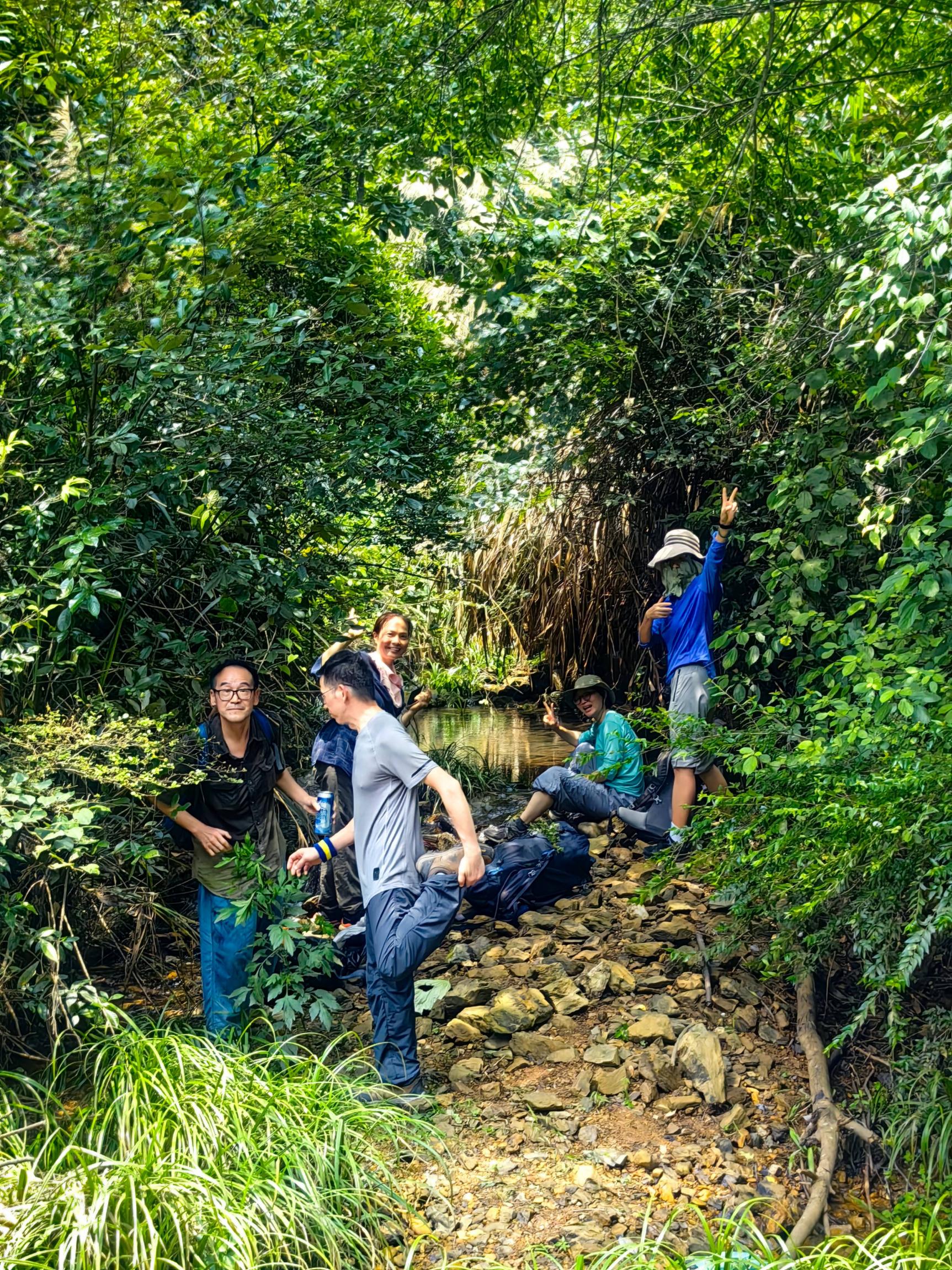 从停车场后边,经过路边小菜园,出后门下坡,长长的静谧风景线,荫凉舒适。下来往右,绿色田野,过沟壑往左,开始沿蜿蜒上升大道前进,只有走路喘气的劲,偶尔寒暄几声,木桐油桶分得清。上到坡顶往右,入森林秘境,下坡石子路,抬头左边山顶是太子庙,右边溪水是我们溯溪休息地。喝可乐冰啤,午餐继续,泡脚洗西红柿上下游自选。