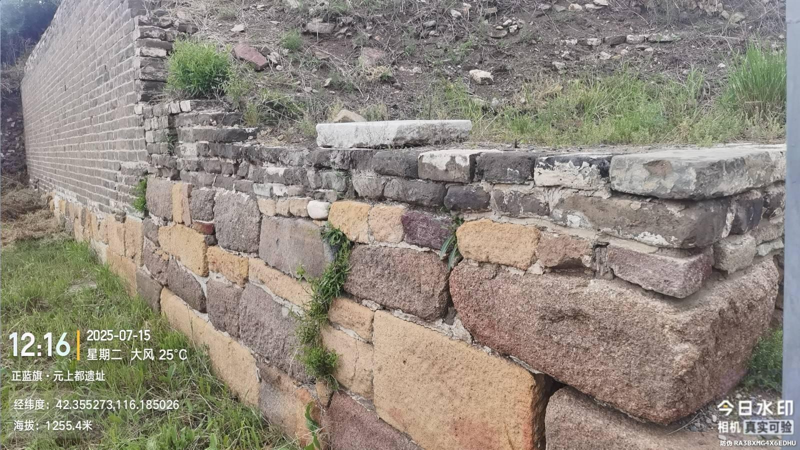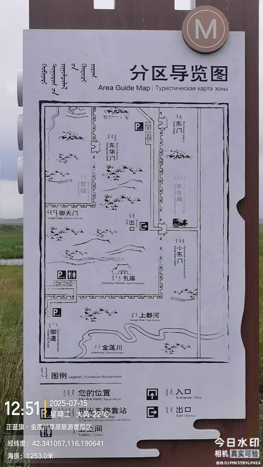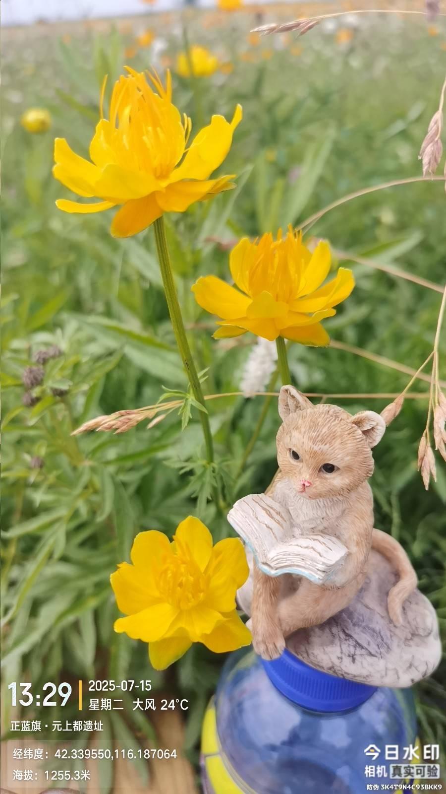 将近十点到达景区大门,这时走了9.7公里。60岁以上免票,省了40元,摆渡车20元可以选择性购票,我继续徒步,这里金莲花成了花海,居然可以移植的花池中,但花朵明显比灵山和小五台的尺寸小。但这里以多取胜,无边无际一片耀眼金色,滦河从这里流过。遗址内三层城墙,只是少了东侧和南侧的第三层。城墙也就是土堆,主要城门和宫殿有一部分砖石,但这里发现带“清”字砖不明白意思,挖掘的主要文物都存在此处西南5公里处的博物馆里面,免费参观。