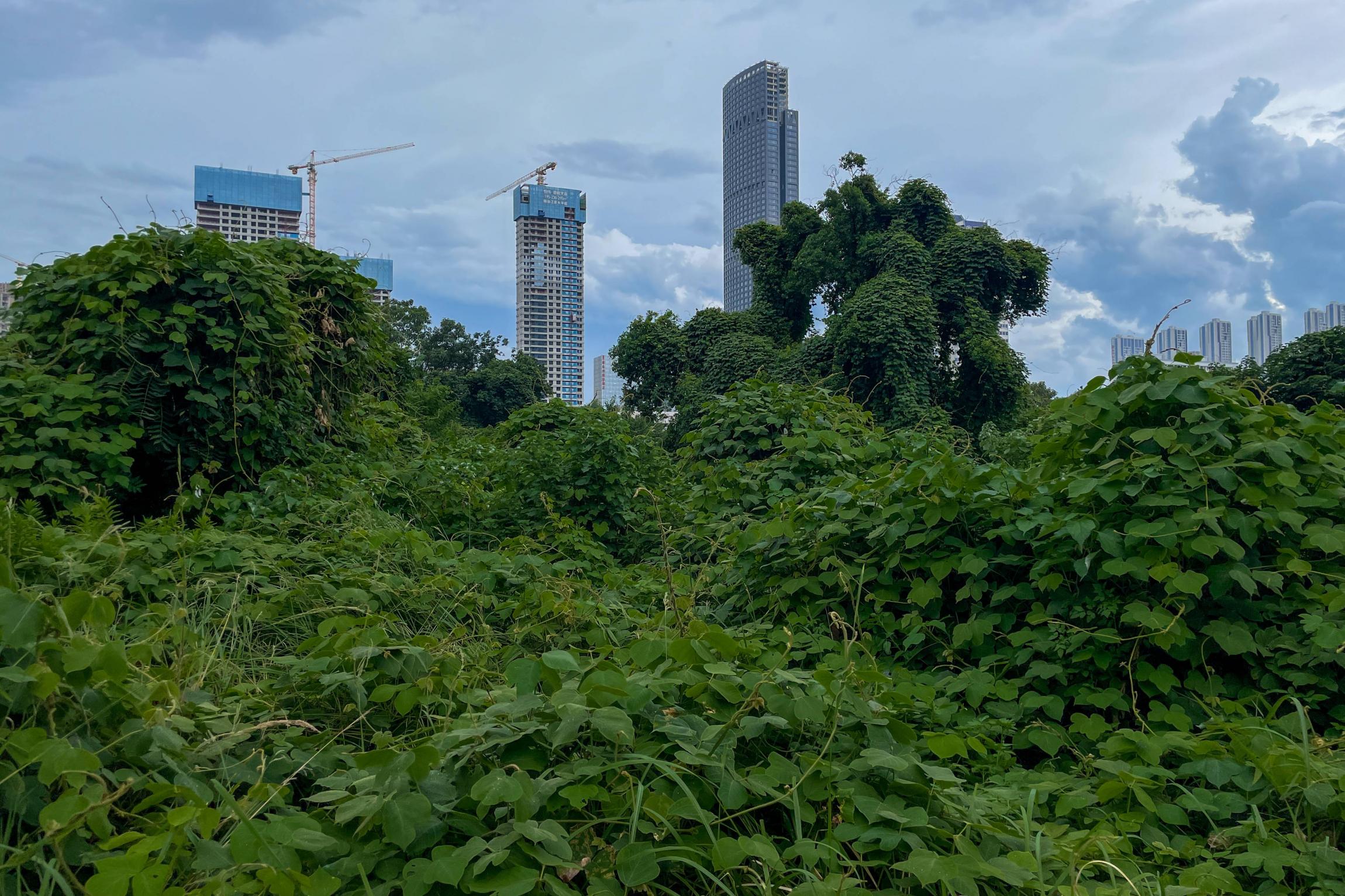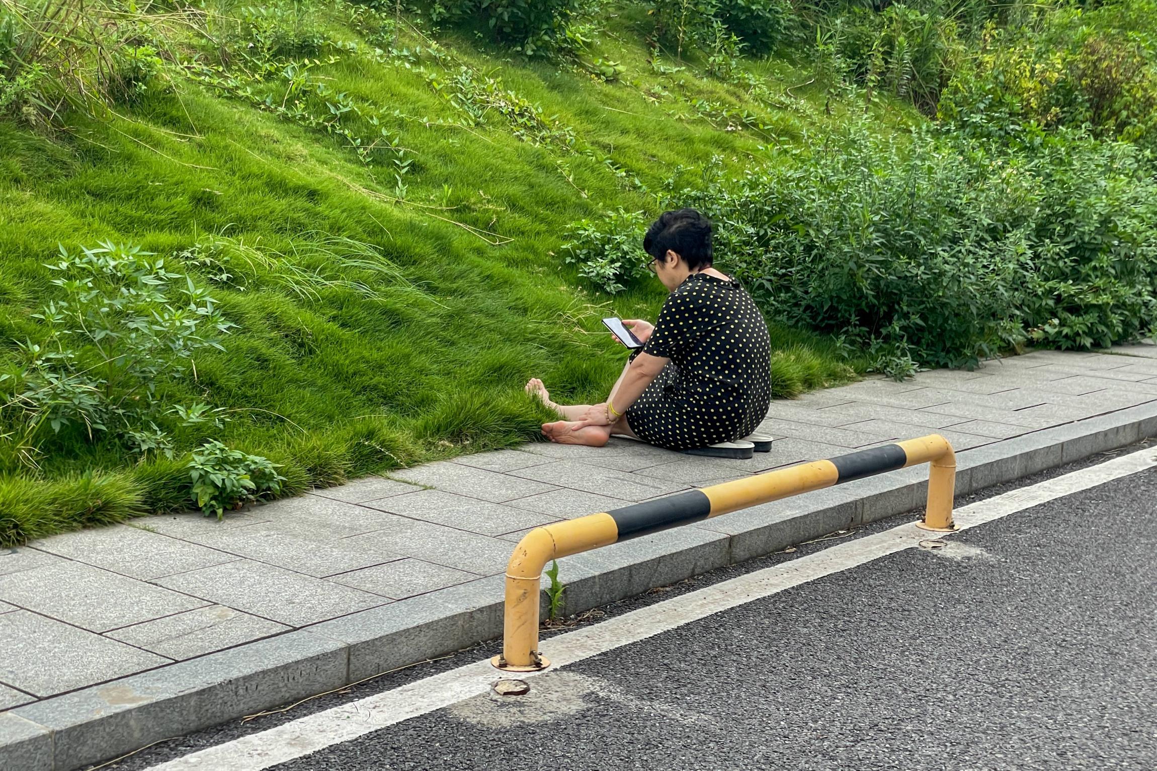 靠黄兴路方向,有两三亩待开发区域,杂草藤蔓疯长,不仅爬满围墙,还爬上了大树,就像城市里的一块“飞地”。征收的宿舍楼人去楼空,楼下却停满车。围墙上方露出东岳宫一角飞檐。路过王季范公馆时,有风吹过,一位大姐脱了鞋垫坐在路边刷视频。