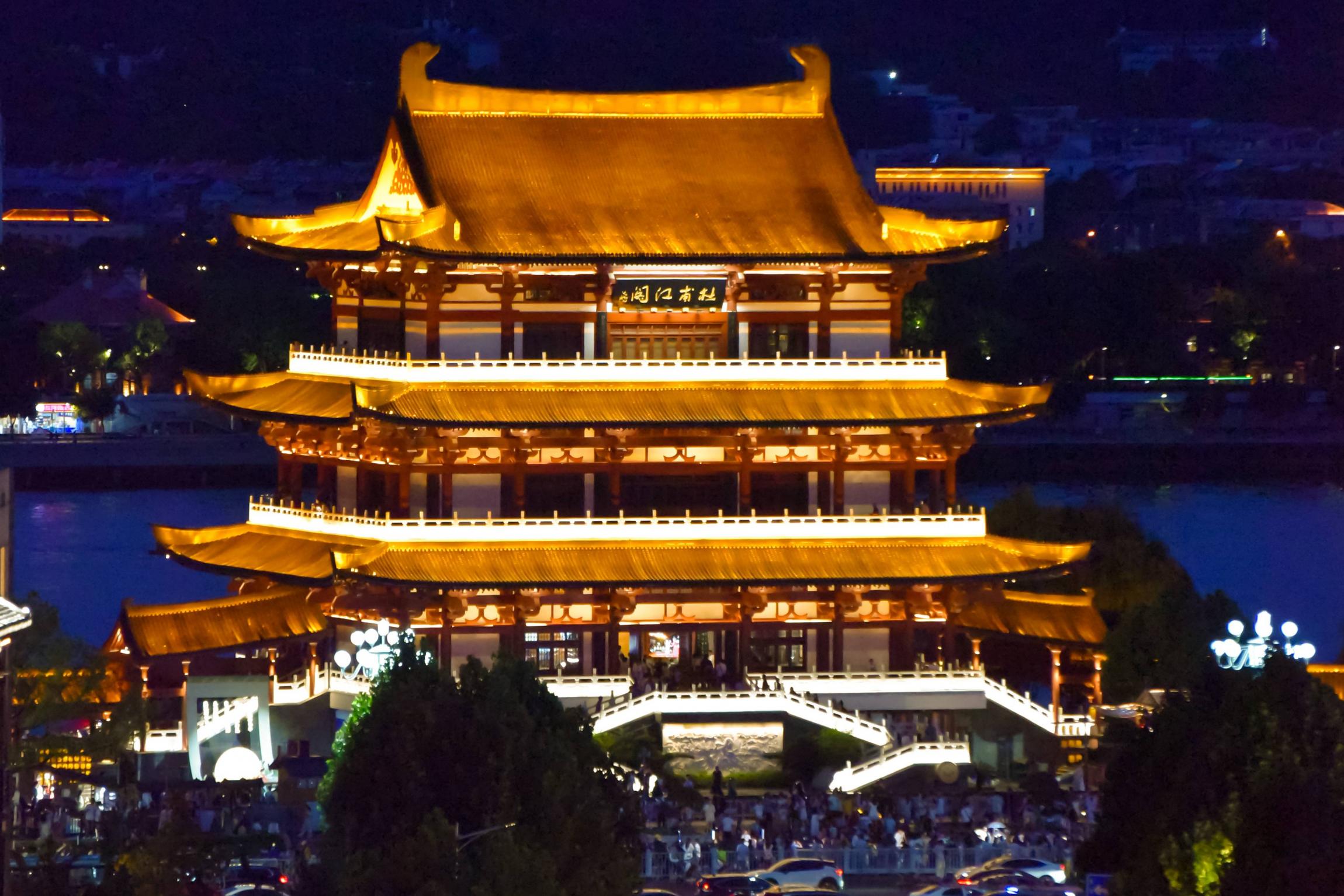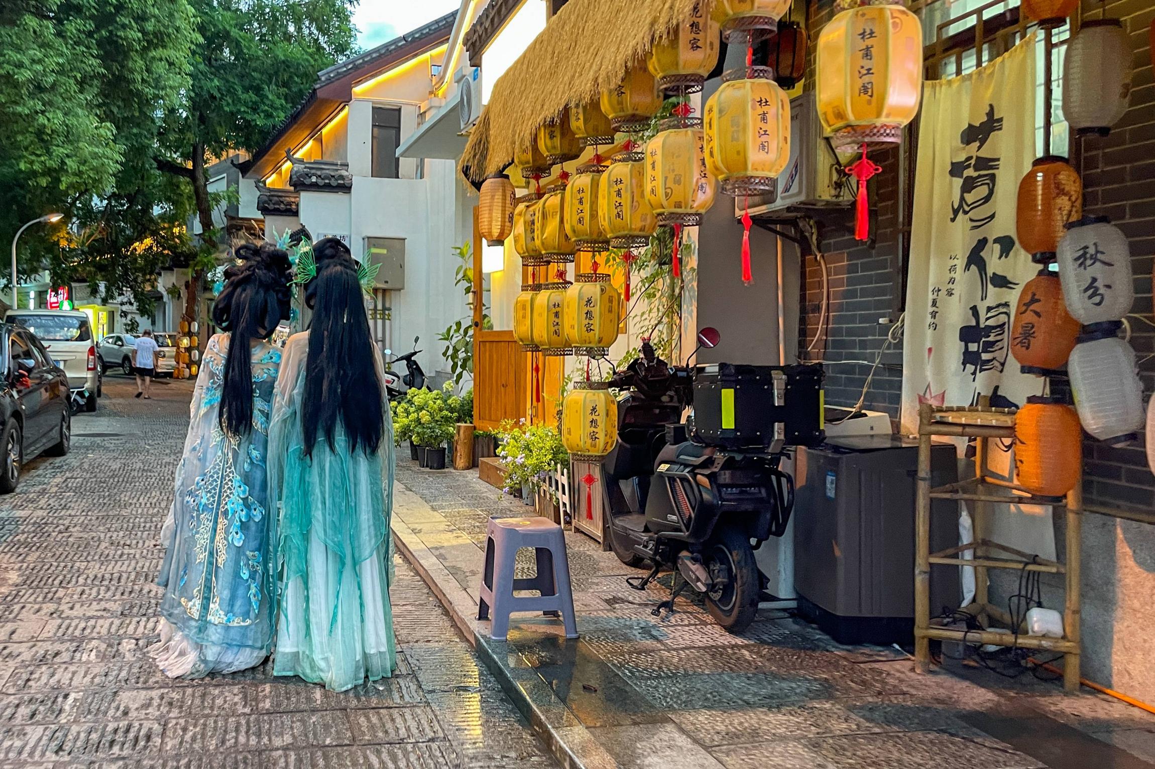 杜甫江阁尚未亮灯,但江边台阶广场等待的人已非常多。周边有不少租汉服、化妆摄影的店。不少学生模样的年轻人已换好精致古装,静候华灯初上那“噔噔”一刻。