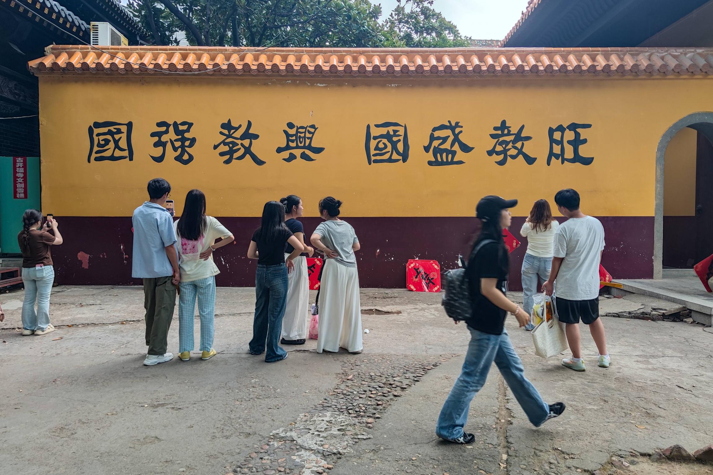 隔着围墙就感受到院内大兴土木,脚手架林立,放生池的老石碑半埋在废弃砖石中,略显落寞。墙上“国强教兴,国盛教旺”大字醒目,有年轻人围着一块“上岸”道具牌打卡。游人不少,十元门票附赠了一小束香。我在焚香炉前愣神片刻,最终将它丢进炉里。