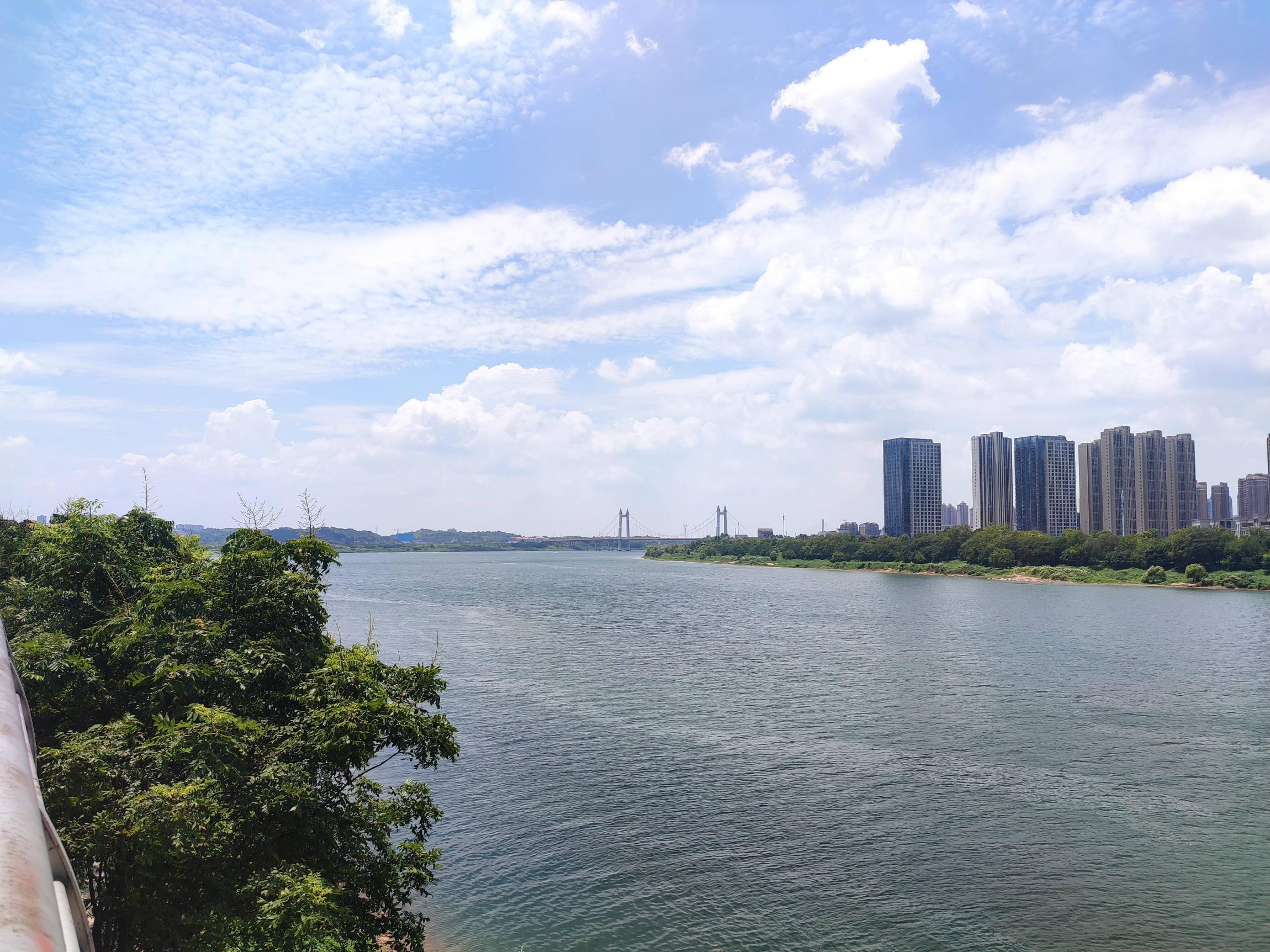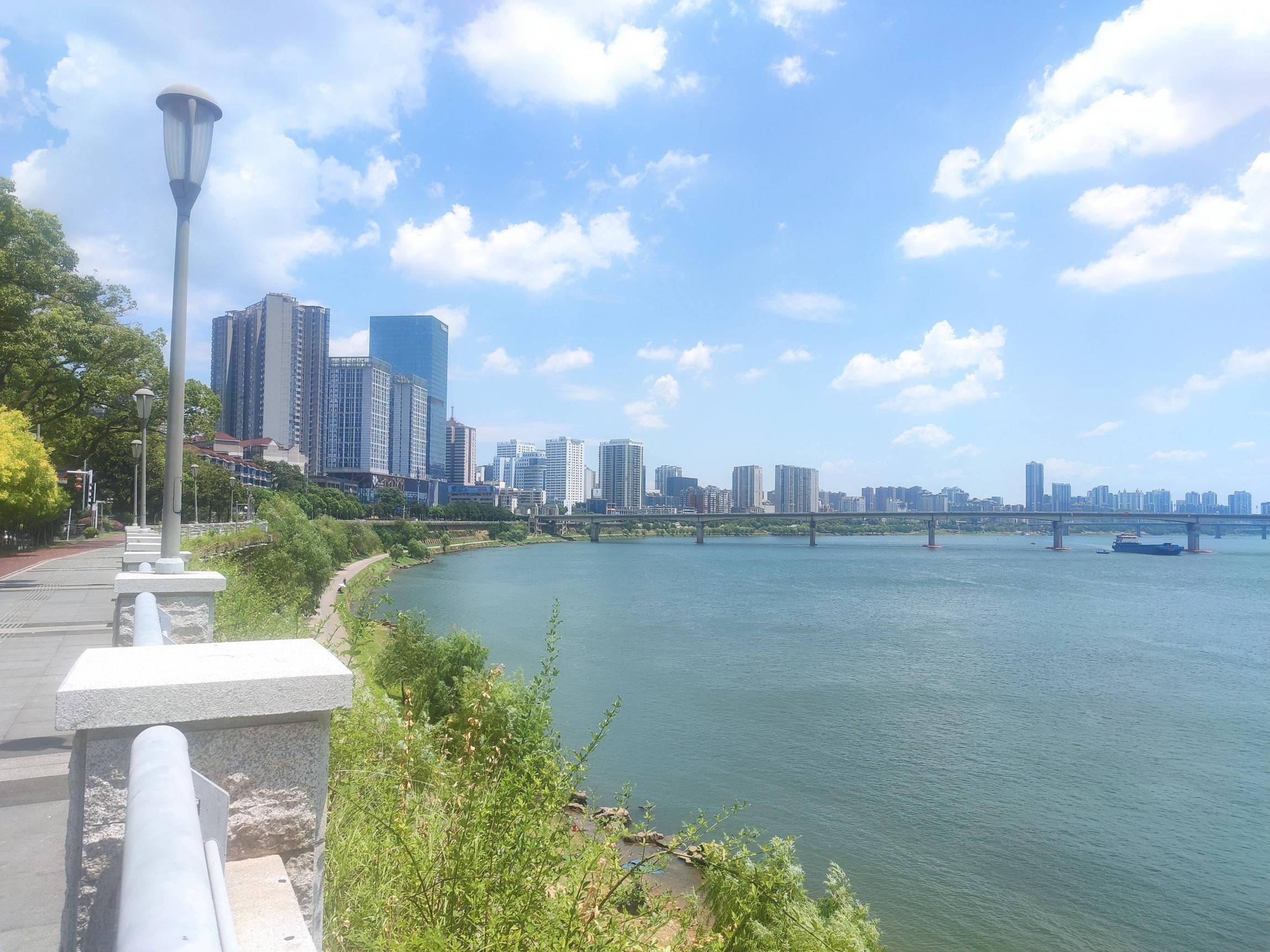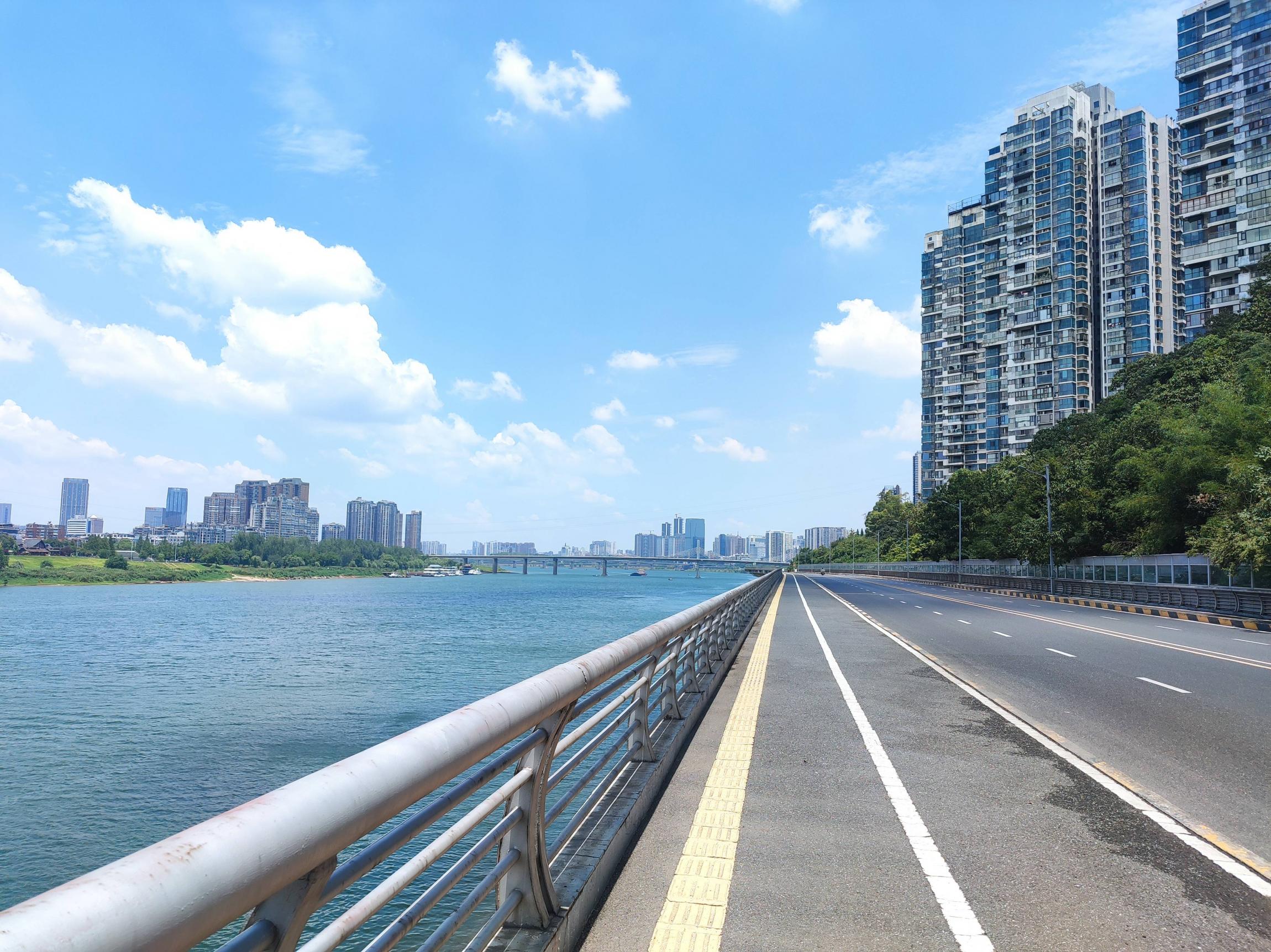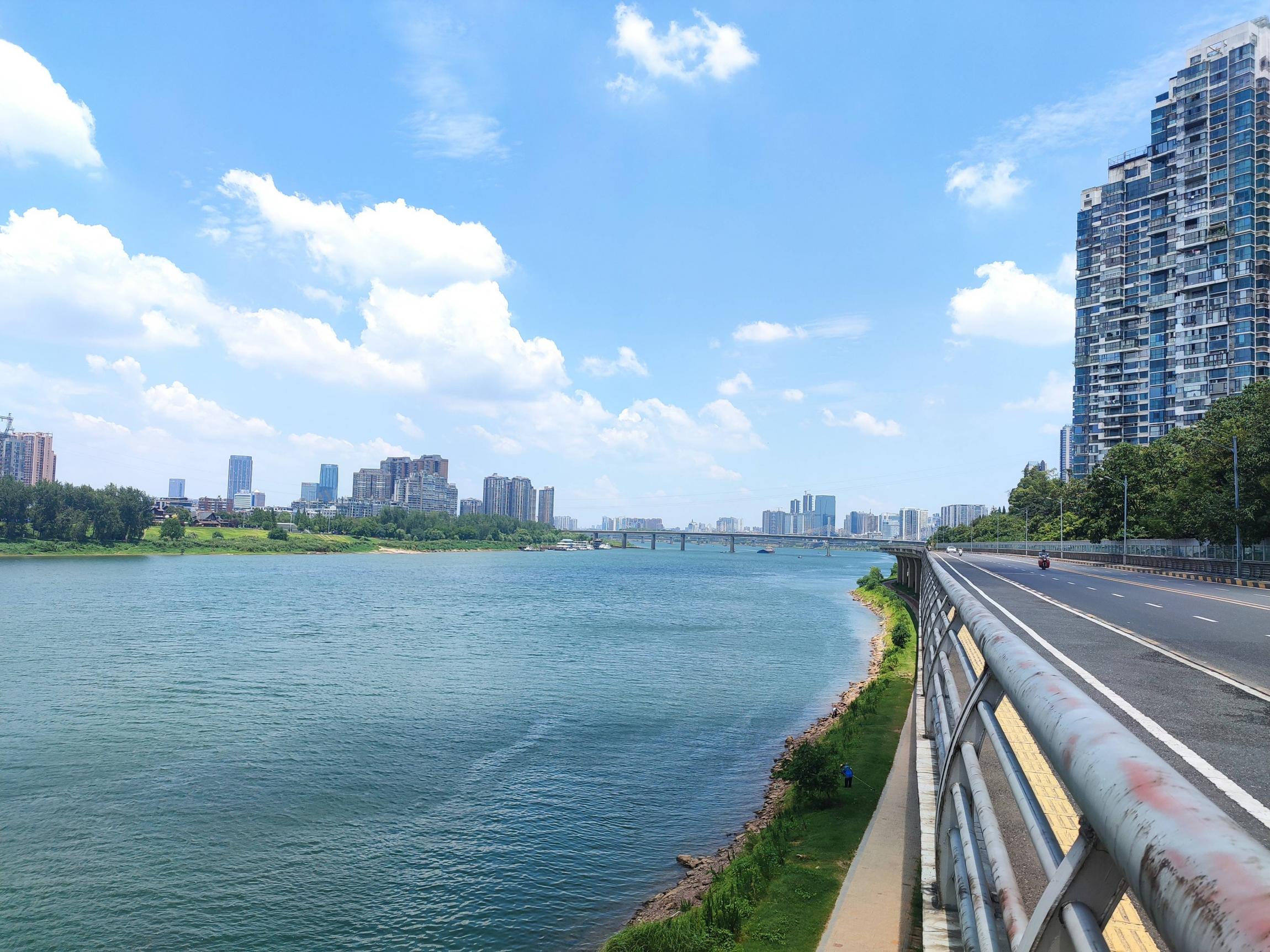 沿湘江边的沿江路顺时针向北骑行,蓝天白云,江风阵阵,体感温度至少45度以上;