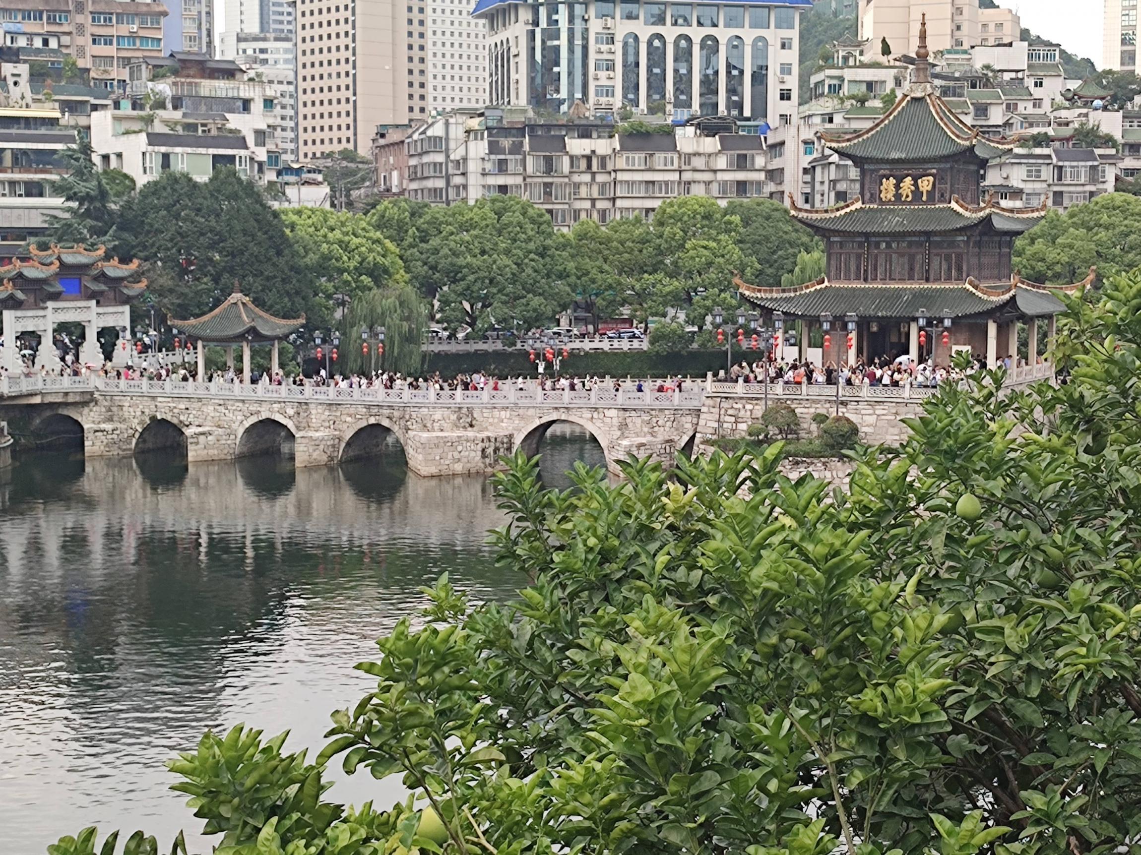 甲秀楼是今日行程的高潮。这座始建于明代的楼阁,矗立在南明河中的巨石上,历经多次重修,依然风姿绰约。登楼远眺,贵阳城尽收眼底。现代建筑与古老楼阁形成鲜明对比。甲秀楼像一位历经沧桑的老者,静静地看着城市的变迁。
