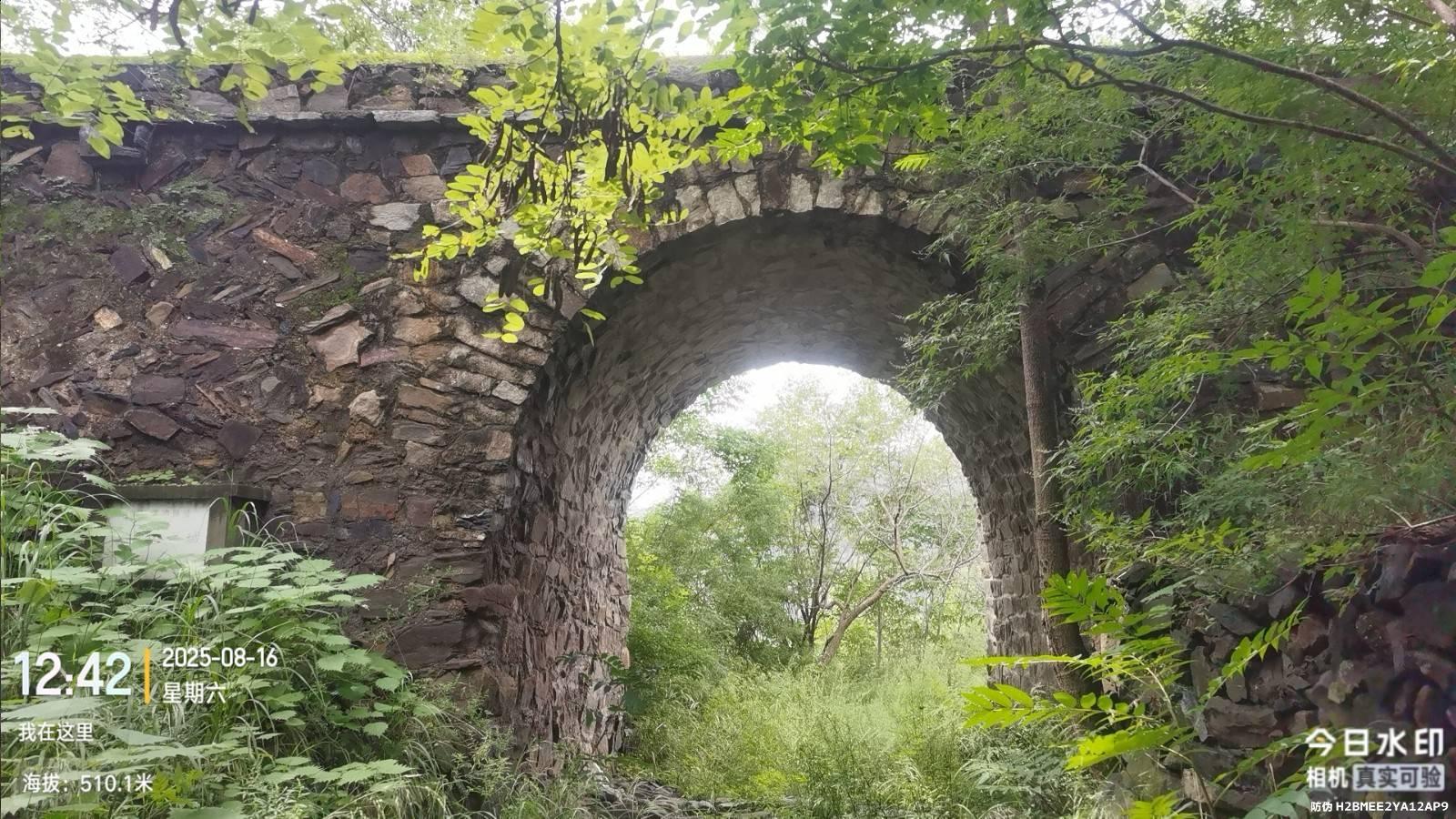 下山走梯田找到了小路,复走到护栏路,也就是上去处沟北侧,路下面有个排水的大水泥管子,往前走终于见到隧道,长10米左右,北口水泥抹面,南侧青石裸露。高约三米左右,符合通行矿电机车挂煤斗车技术条件。之后有果林,还有半个水缸。东侧50米坡下开外就是大路,有4个防火队员巡逻,还说前几天有个大长蛇过马路。当然他们没有发现我的存在。之后就见到了水泥桥,走上去还看了看,桥南侧横梁上面是标注1955.5标记。桥南侧坡上是一片废村房子,我猜测煤窑口应该在那个区域,草高林密,有机会再找吧。