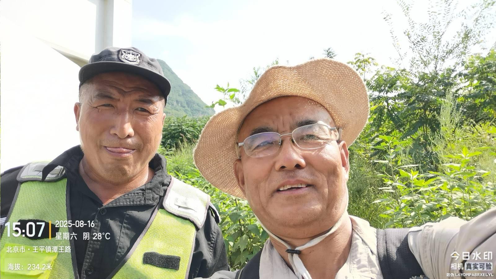 又走到潭王路了,树下休息,有个50多岁自称河间县人氏保安叫王立军,和重庆那个去美馆人同名,他在瓜草地路口防火岗亭上班已经4年了。上次好像就遇到是他,他说信佛,刚给路北接水处放了2块垫桶的木板。他还养了4只黄猫。他还说河间驴肉大部分都是马肉和骡子肉。聊的火热,他执意要免费送我一个手机壳,我比了一下还差不多,他说买错了用不着了。他还执意送我一个木雕花瓶状小饰物,说他姐姐给他买了2个,分享我一个。可惜我也啥东西给不了人家,照了一张合影,可惜他还不玩微信。他还说有谁要小猫免费送,还有单人床免费送。