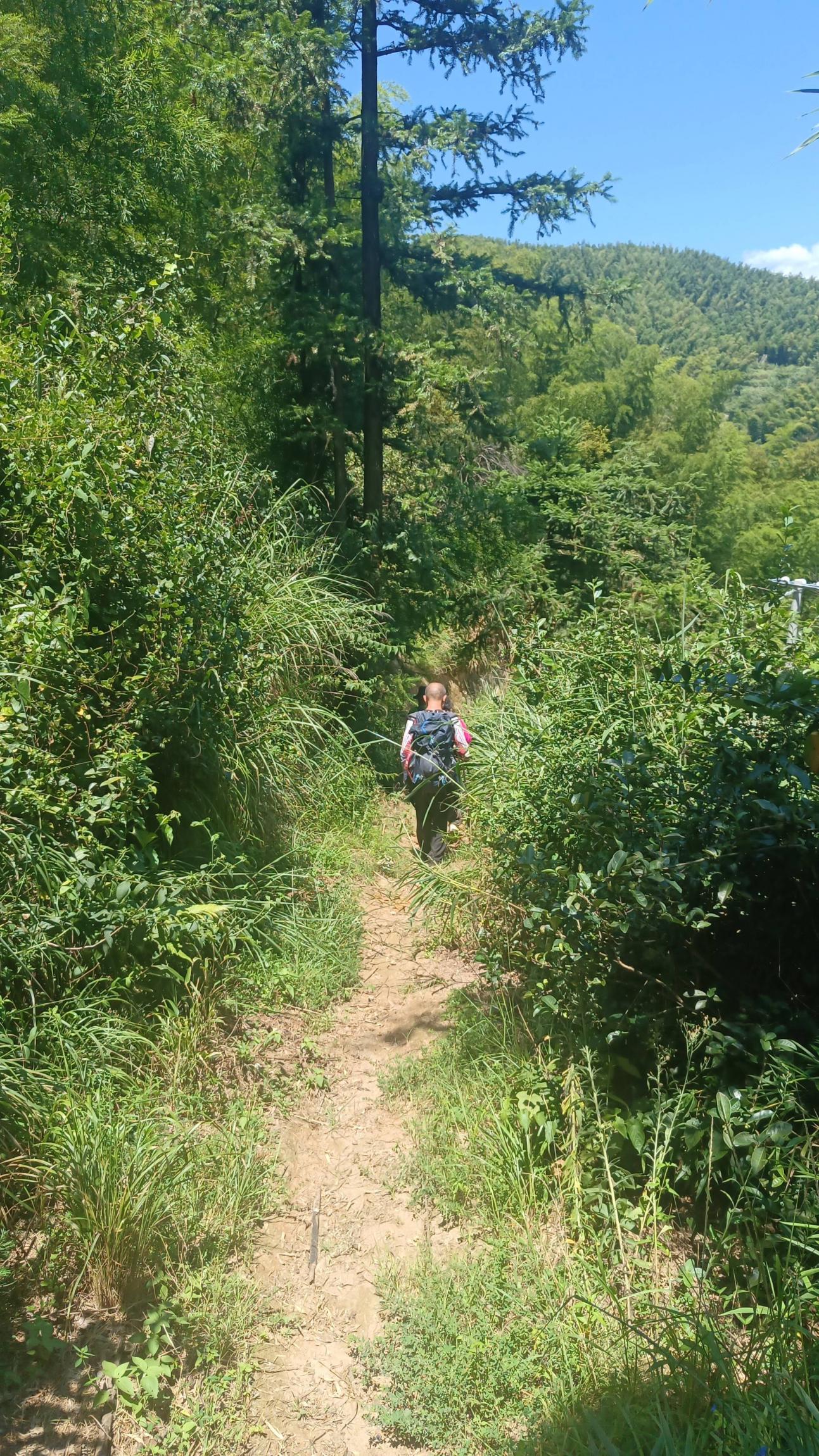 终点站下车后,我们沿小溪流前行,牵手用小锯子,制定两根手杖,一根给云端,经茅香冲直接上山,小路比较陡,上到机耕道,大汗淋漓躺平睡觉,到机耕道分叉口,左边沿老房子进山,老房子边上路长满杂草,再上去一点,左右分叉,左边古道,右边之字上山小路,二个月没有走,小路长满杂草,盖住了路,我们一边清理,一边休息,一边等阿混,