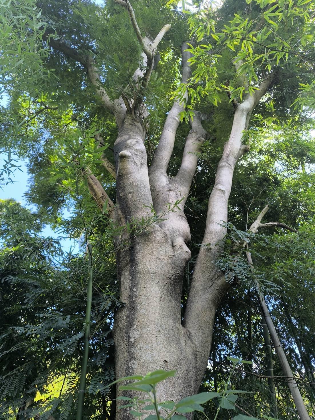 走到荷花村看到了一处荒废的房子,里面打扫的很干净。再往前就是一大片的楠竹,是个挖冬笋春笋的好地方。沿古道上到山顶往西横切,看到一处好大的山塘。右转是几丘荒地,长满了茅草,还看到了一棵槐树,跟曾家山看到的那棵差不多粗,但是没看到古树铭牌。