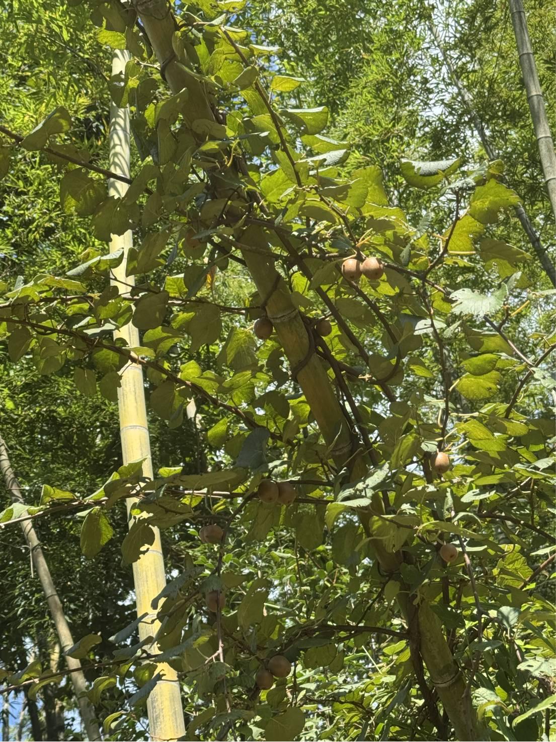 继续前行至一农家,只有老嗲嗲在,烧了壶水,每人都补给了一点。沿机耕道前行,冲里的农田均已抛荒,反而山头上种满了茶树。这一段路很好走,脚感也很舒服,行进速度加快,在山峰村要急转弯的地方看到了猕猴桃,果子比在北山看到的要大许多,我还在犹豫要不要摘,自在鱼说:“这次不摘,下次来就没了”,大自然的馈赠当然需要大自然的搬运工,翻身爬上去摘了10来个果子。我尝了一枚酸酸的,摘的太早了只适合泡酒。大家互相谦让都不要,说没人喝酒,最后一股脑全塞到YM背包里了。