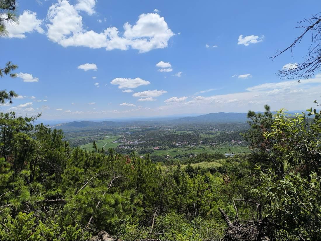 万象他们是从茅香冲上去的,我们是右边一点,沿灌渠走了一段,然后是石板路,多见丛生竹,春季是个挖鸡婆笋的好地方。在要到达机耕道的地方,水牛选择了撤退,大佬的行径果然透露着神秘。机耕道这一段顶着烈日,有点难熬,但是视野渐渐开阔起来,立于高处,四野无遮,极目远眺,万里山河尽收眼底。天穹如盖,远山如黛,长河若练,一片沃野中村落星散。