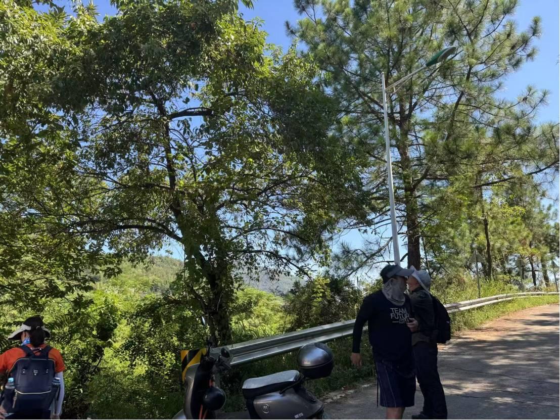9点半在青竹学校集合完毕,沿公路往明月山方向前进。自在鱼和梅在前面带路,两人彷佛多年老友重逢,有说不完的话,时时传来欢声笑语,YM默默跟在后面。今天万里无云,视野极好,又是第一次来明月山,到处充满了新鲜感,我就走在最后面到处看看拍拍。才走了1-2km,一猛男骑电动车追上自在鱼,走到跟前才知道是大佬水牛专门从长沙赶来,他们三个边走边聊,叽里咕噜我也听不懂,大致意思是要跟我们一起徒步。走到XT50终点站附近看到一棵桃子树,低处的桃子已经被人摘光了,本着有枣没枣先搂一竿子的原则,我爬到树上一顿猛摇,每人都吃到了几个。桃子已熟透,酸甜可口。路上有几座桥,都是80、90年代的水泥桥,就没兴趣观察记录了。