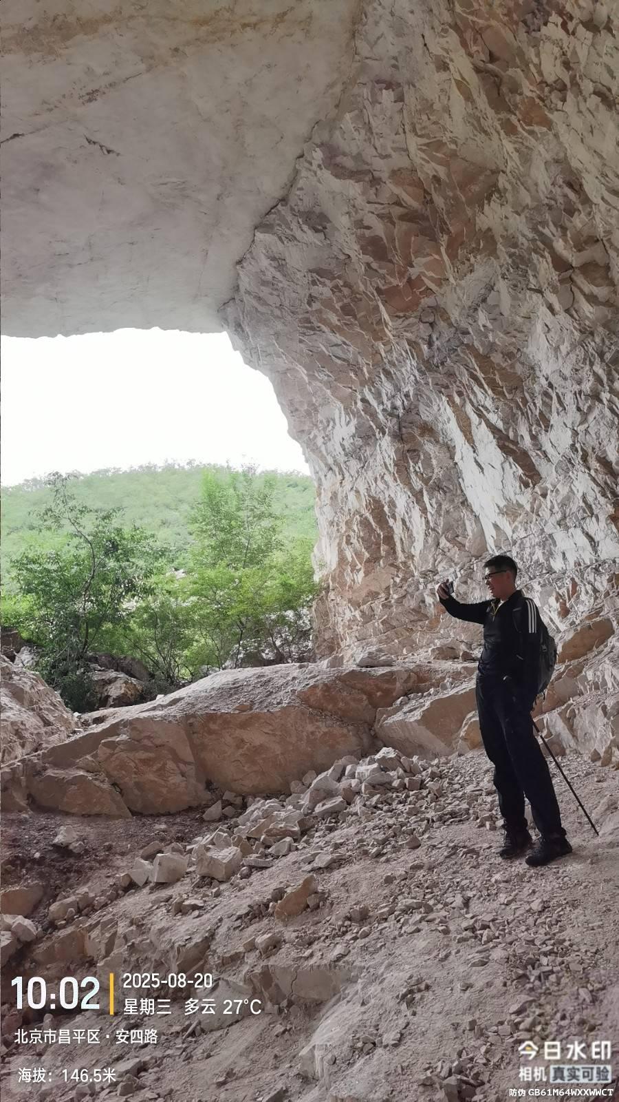 山脊西行到垭口左拐,山谷中是一片采石场遗址。此处原料主要是做水涮石和墓碑原料。现在是停采植被恢复完毕。采石场左右两侧洞有若干,比较典型的是民间叫天神之眼,两个大洞之间有个立柱支撑,远看就像一个眼框,洞内北高南低,长约50米,高约8米左右,崖口顶石头破碎,有水不断滴下,不宜久留,地上落石很多,十分危险。