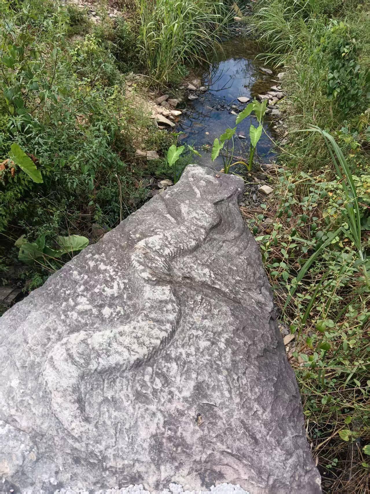 小溪中间两孔丁家桥,清代道光五年古建筑,合体尖面大蜈蚣,似龙似蛇水中游。蜈蚣避水,庇佑桥体平安。踏步桥上,观荒芜之地,想古人智慧,蛇怕蜈蚣,蛟龙似蛇,为避免蛟龙兴风作浪,而用大蜈蚣来护桥,曾经这里应该是气派热闹的地方。今日只有青山绿谷,一车一人一群黑山羊。路边农户都搬出山谷,留下房屋残存痕迹。一上坡路边,芭蕉开花结果,小小的芭蕉未成熟。
