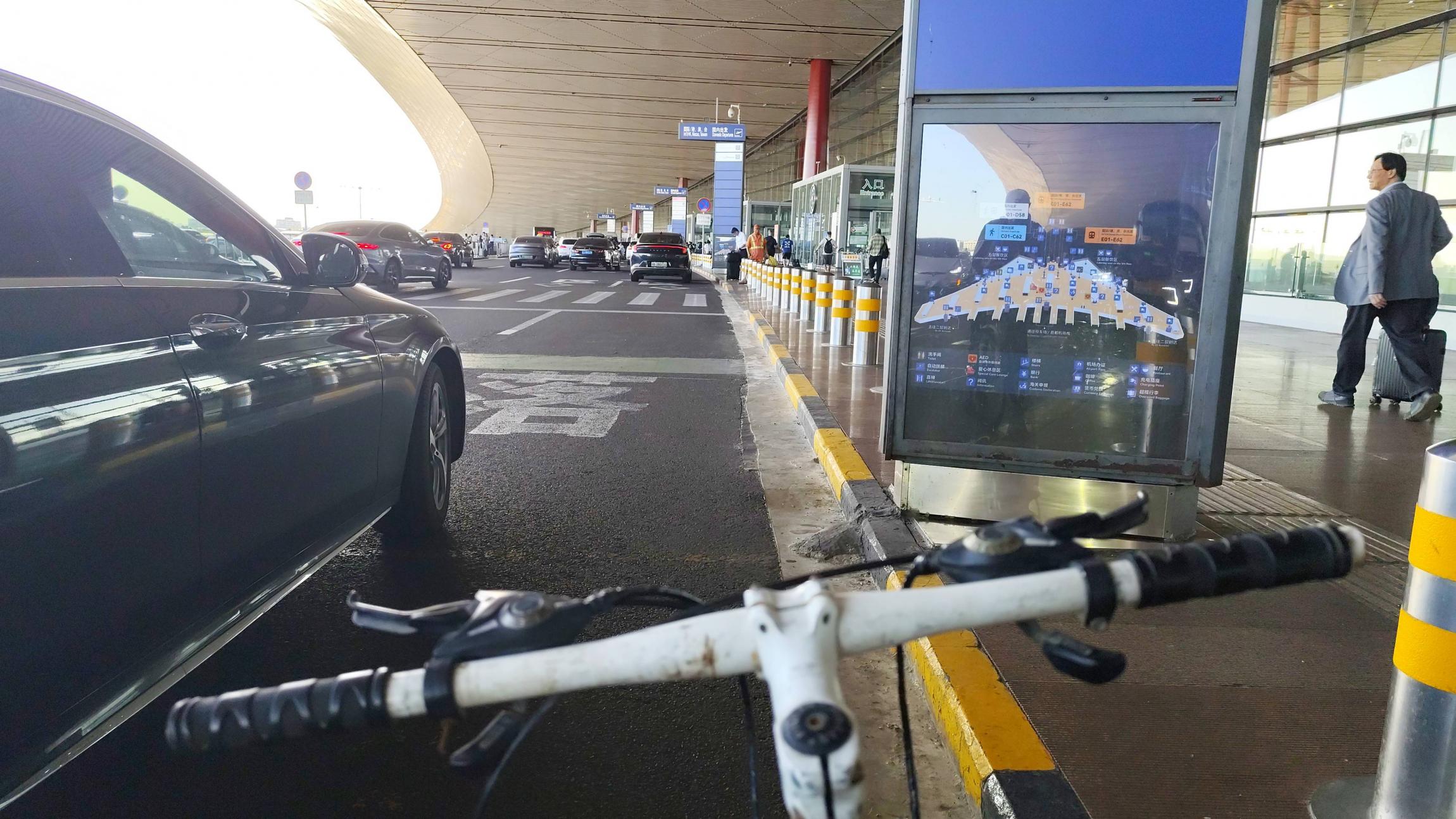 骑到天竺,跟奥森买的脉动和接的一瓶水已经全部喝光,在T3航站楼南边的一个不知名商场买了点水,继续骑行。T3航站楼的交通系统对骑行极不友好,先试了试三经路,尽头是内部员工停车场,难以接近航站楼,且无法停自行车,再试了试环状公路,有非机动车禁入标志,骑到了航站楼旁边的落客区,没人管。