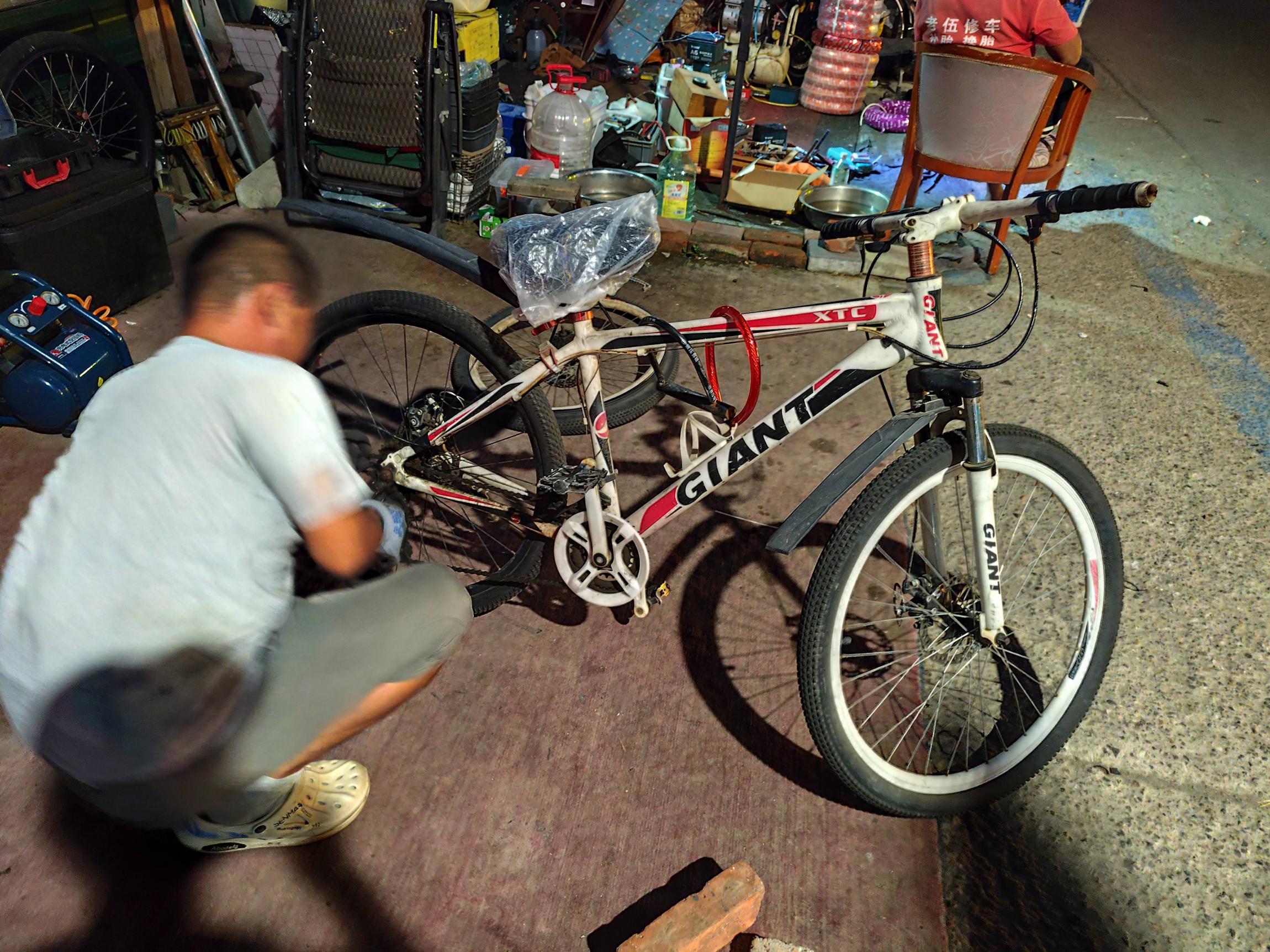 想着想着,已经走到了,地图上标注的“修自行车电动车”店铺位置,天差不多黑了,路口这边往那边看,没看到房子,还以为已经拆迁了,到了对面,发现修车铺近在眼前,没有房子,是一个用三蹦子、快递车临时拼凑起来的小铺,感觉希望大增。跟店主说明损坏情况,店主同样说要换整个轮组,光补胎换胎没用,轮组已经变形了,对面看了看,说是26寸的,得看有没有能匹配的,于是走到了改装快递车后边,掀开苫布,里面放了几辆自行车,不知道是不是回收的,店主打量了一会,说:“尺寸匹配的倒是有,但没有你那样白色的”,181回复说:“没事,我就平常骑车溜达溜达,不在意颜色”,对面又说:“你这车看着有年头了,要不要考虑换一辆,换轮组120,换车150”,181稍微思索的一下,说:“您这几辆车是新车还是二手的?”对面答:“就150怎么可能买到新车,这几辆都是别人找我代卖的”,181遂说:“嗯,那还是换轮组吧”。对面一边手脚利落拆掉两辆车的后轮,一边念叨:“今天给你换了,过后还得找人去定一个轮组”,181连忙道歉:“抱歉麻烦您了,今天没您我们这还真不知道明天得怎么上学”,对面问:“还在上学?”181回答:“还在上高中,平常骑自行车两点一线,今天周末,天好,想着上机场这边转转,没成想半道轮组就崩了”。对面装上车轮,又说:“你这个变速也已经使不了了吧”,181回答:“四五年前就没法用了,不过没大事,换挡听说是只在山路有用,这车名义上是辆山地车,但从来不往山上骑,城里边骑一会,也用不着变速”。对面配置好链条,调了调螺丝,确保链条和轮子不会接触,又给检查了一下车闸,说:“你这辆车后闸有点不灵了,前闸还行,平时尽量用前闸,后闸少用”,181点了点头。装好车,平地上轱辘转得挺顺,交了120块钱,骑一圈试试,发现后轮一带有“嘎嘎”的响声,于是回来询问店主,是不是这个轮组还没调试好,店主把车放倒,转了几圈停下,说:“不用修”,又把坏了的旧轮组拿来,指着变速齿轮说:“看看你这个旧的齿轮都被磨成什么样了,我这个齿轮是新的,磨合几天就好了,不影响骑车”。