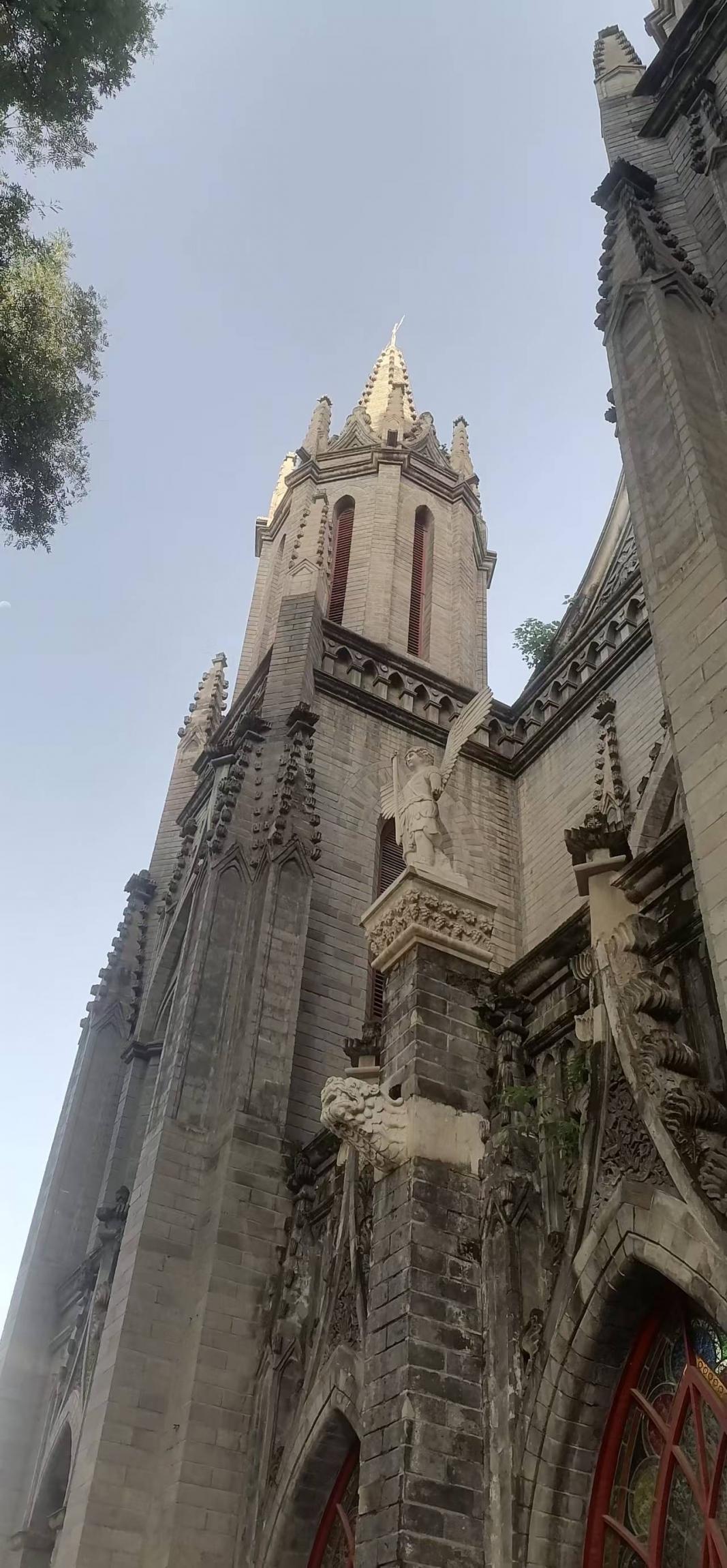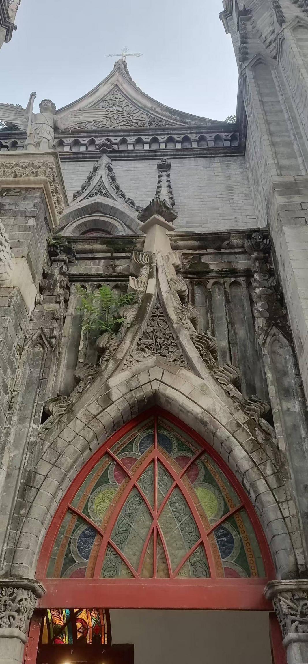 出公园经过两个大医院到东交民巷,西行至比利时使馆和圣弥额尔天主堂,教堂里正在做弥撒,照例进去看一眼听一耳朵。礼拜堂正门的花玻璃很好看,钟楼下有个龙头一样的装饰物很中式,看来哥特式也做成中西合璧。