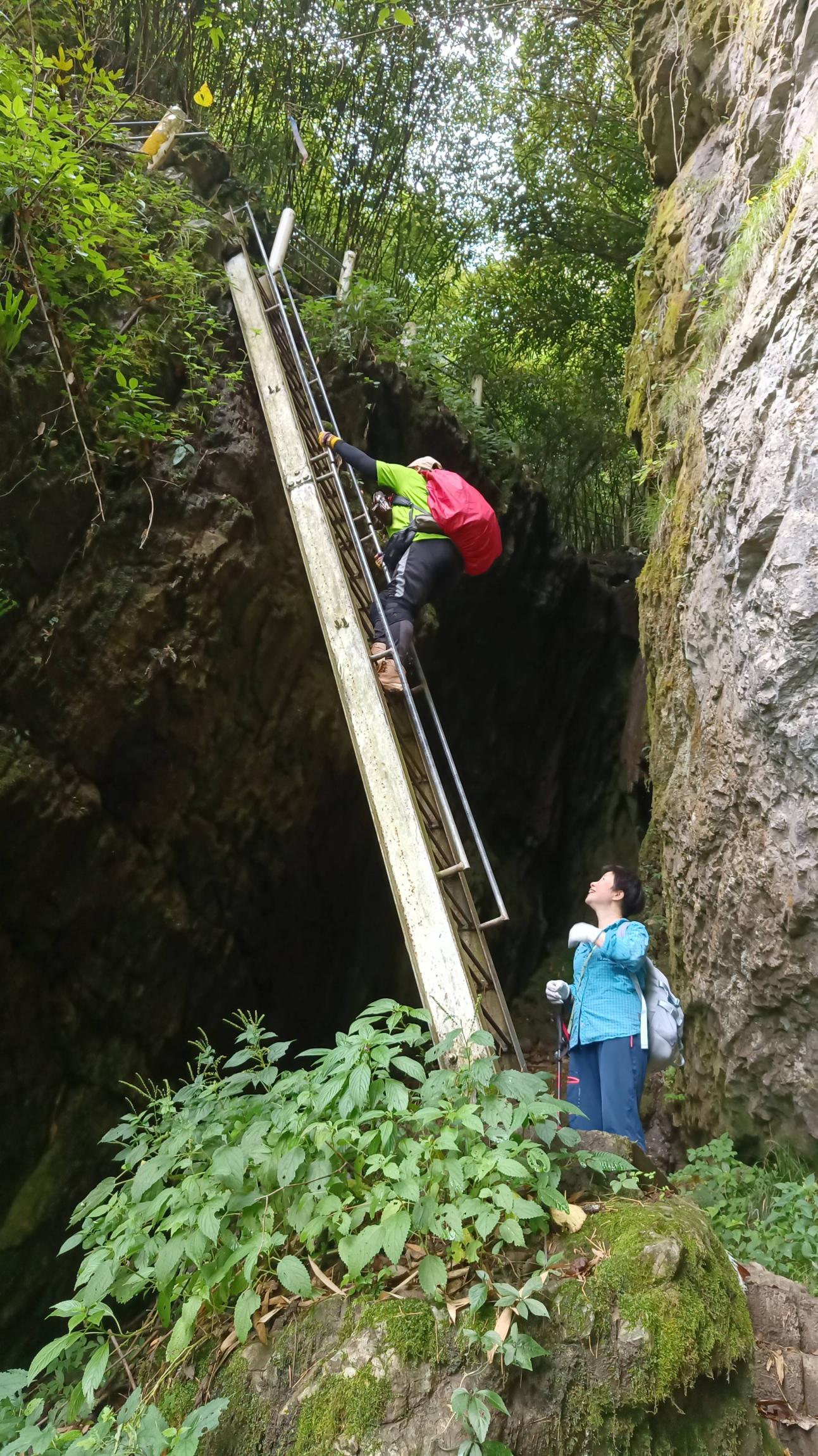 开始爬天梯了,当地政府为笋农办实事,原来腐朽木梯,已经更换成钢梯,钢梯一个接一个。