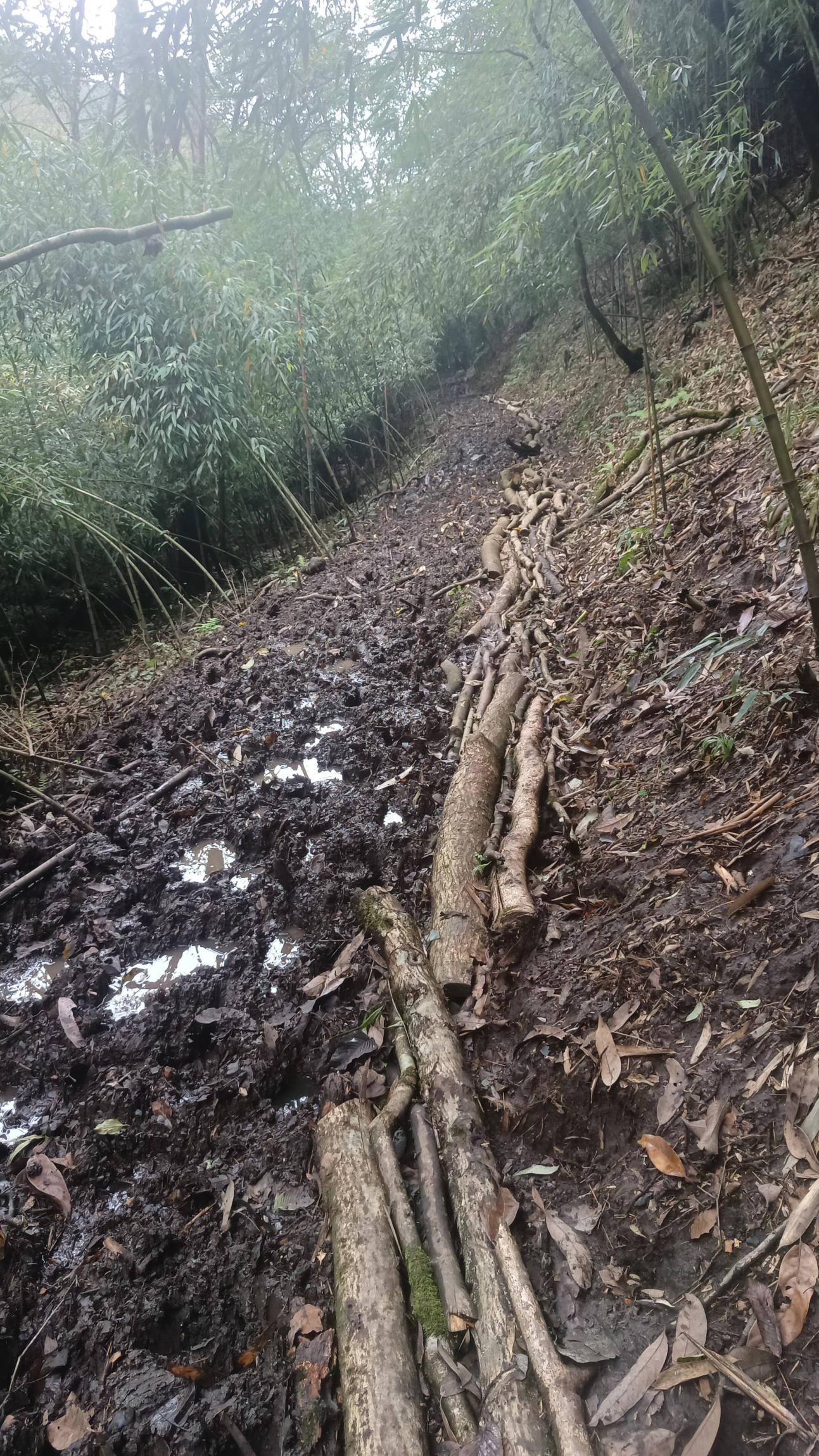 可能比重庆穷,山路泥泞,没有小水泥路,临时铺了一些木头或者竹子,背方竹笋主要靠马驮,道路被马踩得泥泞不堪,无法下脚,这是我碰到最烂的路。这里是贵州与重庆分界线。