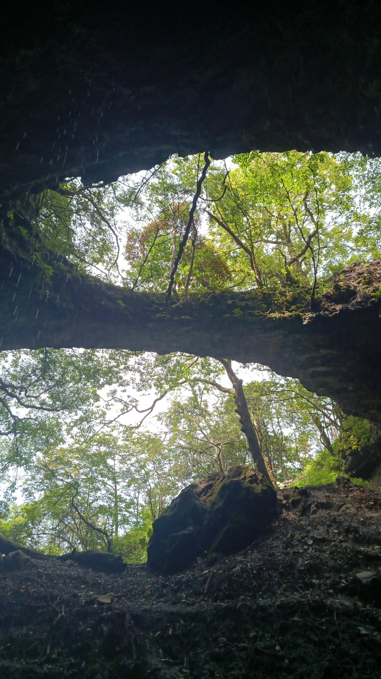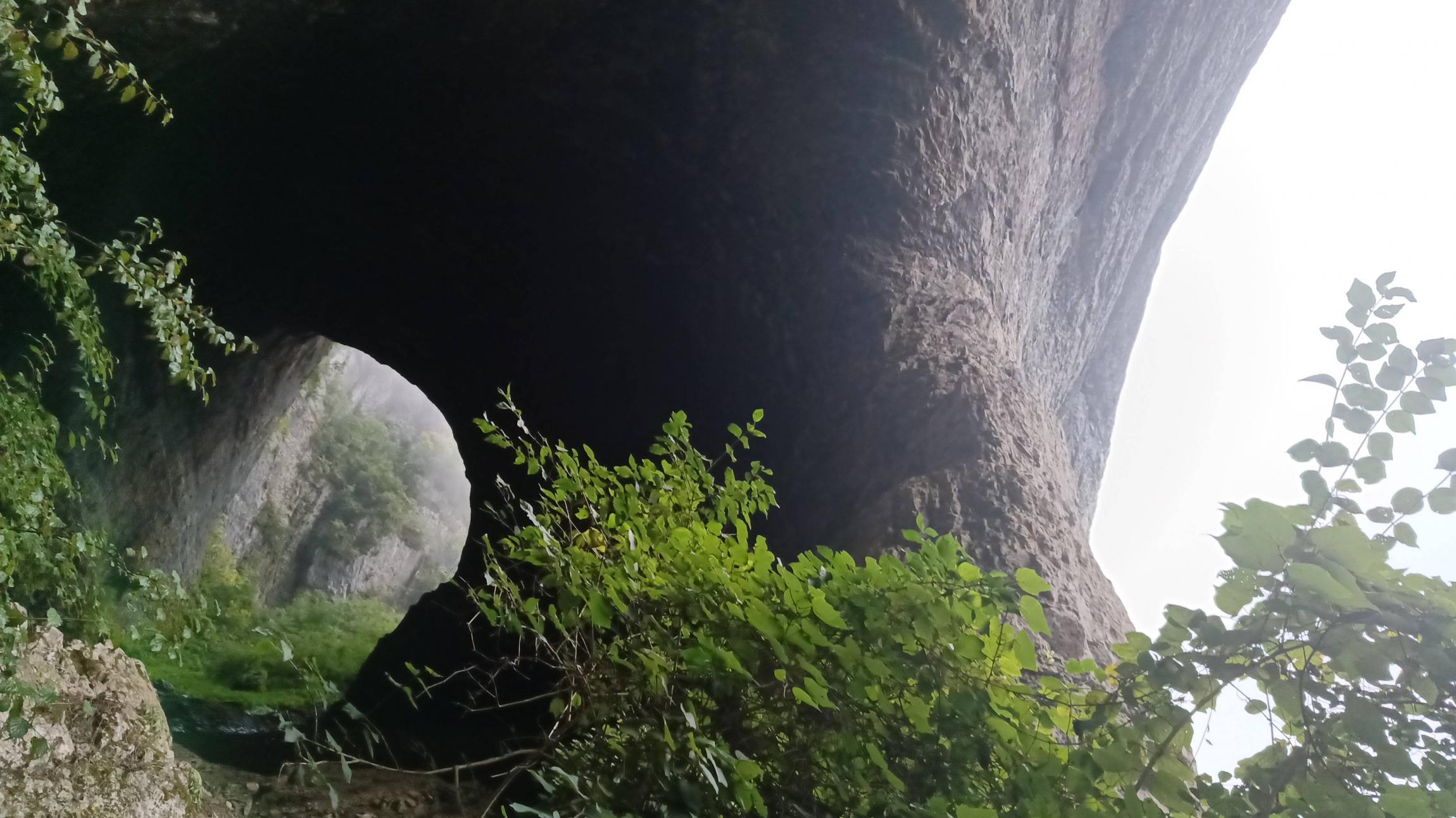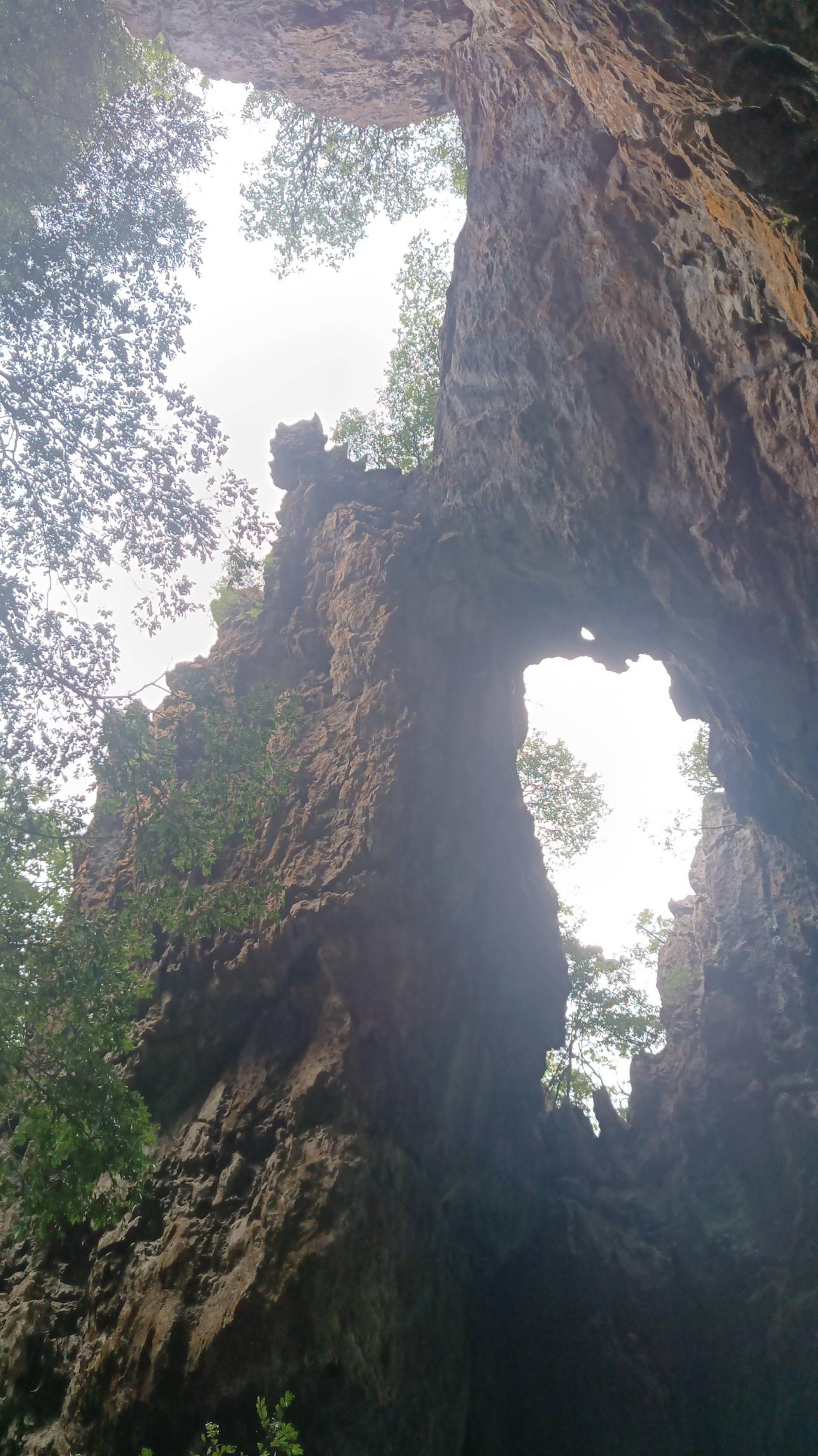 来到双生洞和天生桥,真乃大自然鬼斧神工,外面看一个洞,里面看二个洞,天生桥,大约10米长,宽1米多,比较薄,上面生长6棵树,好像随时可以跨掉。