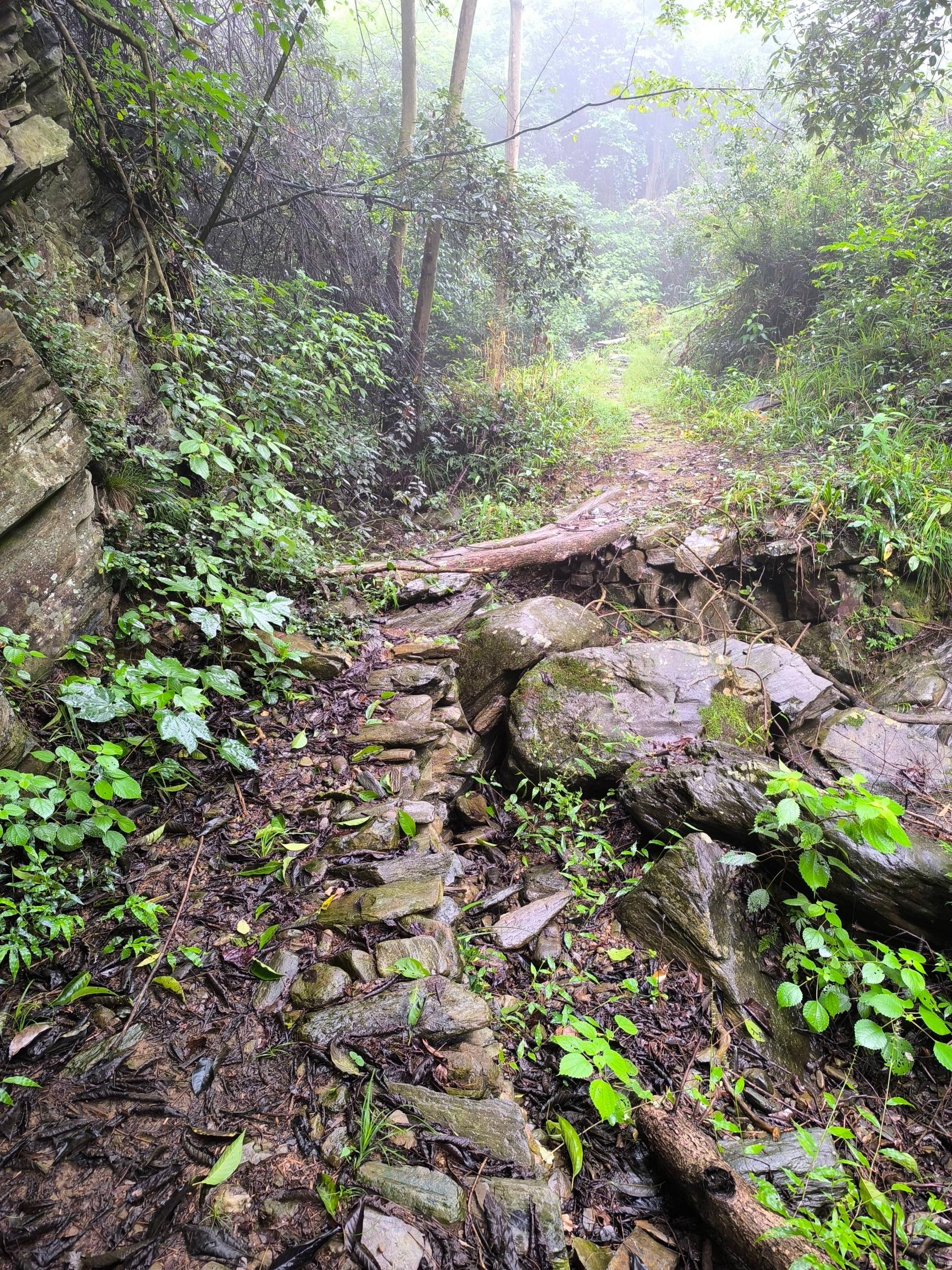 穿过一片农田就到了龙华山脚下,这时雾气浓的像化不开的墨,天色黯的像熄灭的炭,一副山雨欲来的样子。很快就到了“进香小道”,昨夜下了雨,茅草上尽是晶莹剔透的水珠,突然想到了一句宋词“吹落一天残雨,苍翠湿千峰”,草色在水珠映射下真的是苍翠欲滴的。小道很古朴,或铺石板,或依山势,蜿蜒前行。左边溪水淙淙,右边山石嶙峋,脚下青草依依,我走在最前面,呼吸着最清新的空气,享受着最纯净的露水,心里美滋滋的,暗嘲后面的走友,叫你们爬得慢,连空气和露珠都是二手的。今天做足了防雨的功课,就是没做防水的,很快裤子就湿透了,鞋子里也进了水,上身也汗透了,我毫不在意,反而感觉特别惬意。