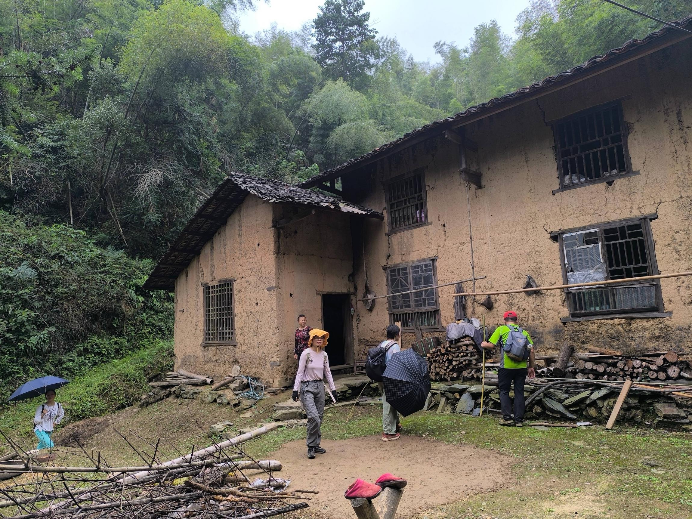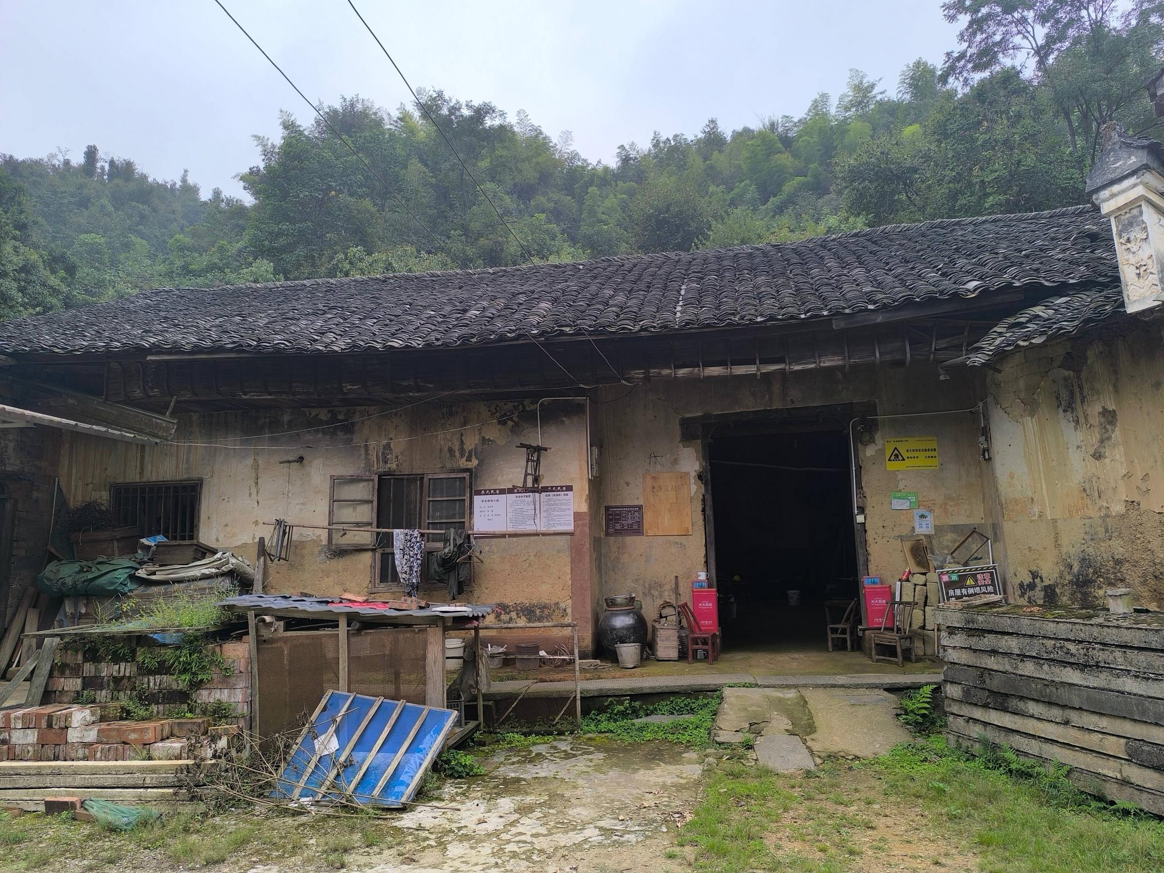 然后就是万家冲至双江村这一段的山谷了,万家冲至瓦窑坳是机耕道,长满了低矮的茅草,沿途有几处废弃的房子,虽已人去楼空,屋檐下却码了整整齐齐的柴火。瓦窑坳处还有一户人家。院子前有一处小小的池塘,塘边有桑树、芭蕉之属,庭院里青苔浅浅,洋姜花开正艳,一群鸡鸭啄食一枚腐坏的南瓜。这是一座上了年纪的土坯房,北边厢房还可看到忠字,大概是那个年代跳忠字舞的地方,地上摆放着一些坏掉的家具,木板上还可看到斑驳的漆画。南边是厨房,中间有一座土灶台,灶身堆着三层土坯,每层都裂着缝。灶面是用水泥抹的,一口大铁锅嵌在上面。灶边的地面上,一个长嘴茶壶被常年烟熏火燎,黑黢黢的,壶下是一堆余烬。一个满头白发的老奶奶坐在门口,彷佛在等待出行的游子归来。这个山坳坳那么寂静,那么清幽,彷佛时间定格了一般。