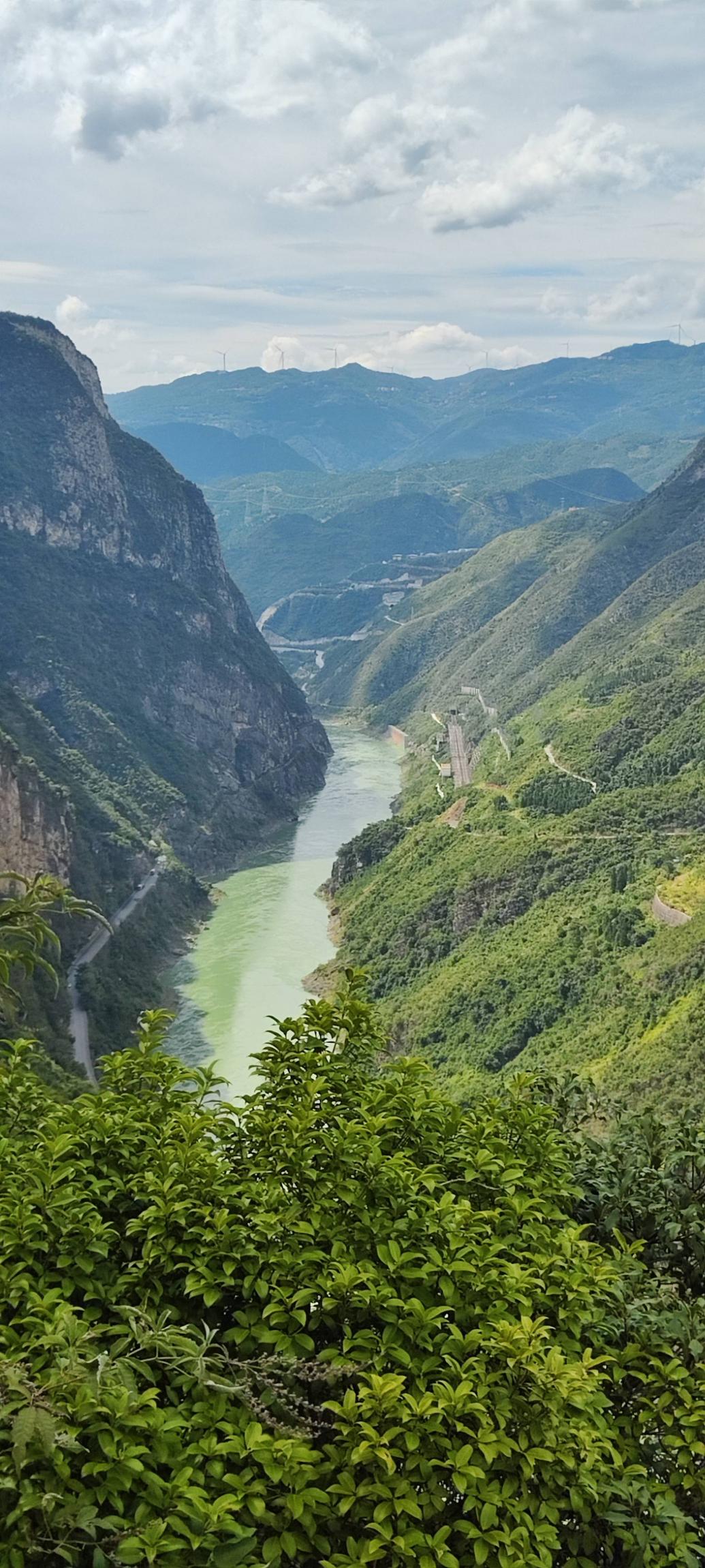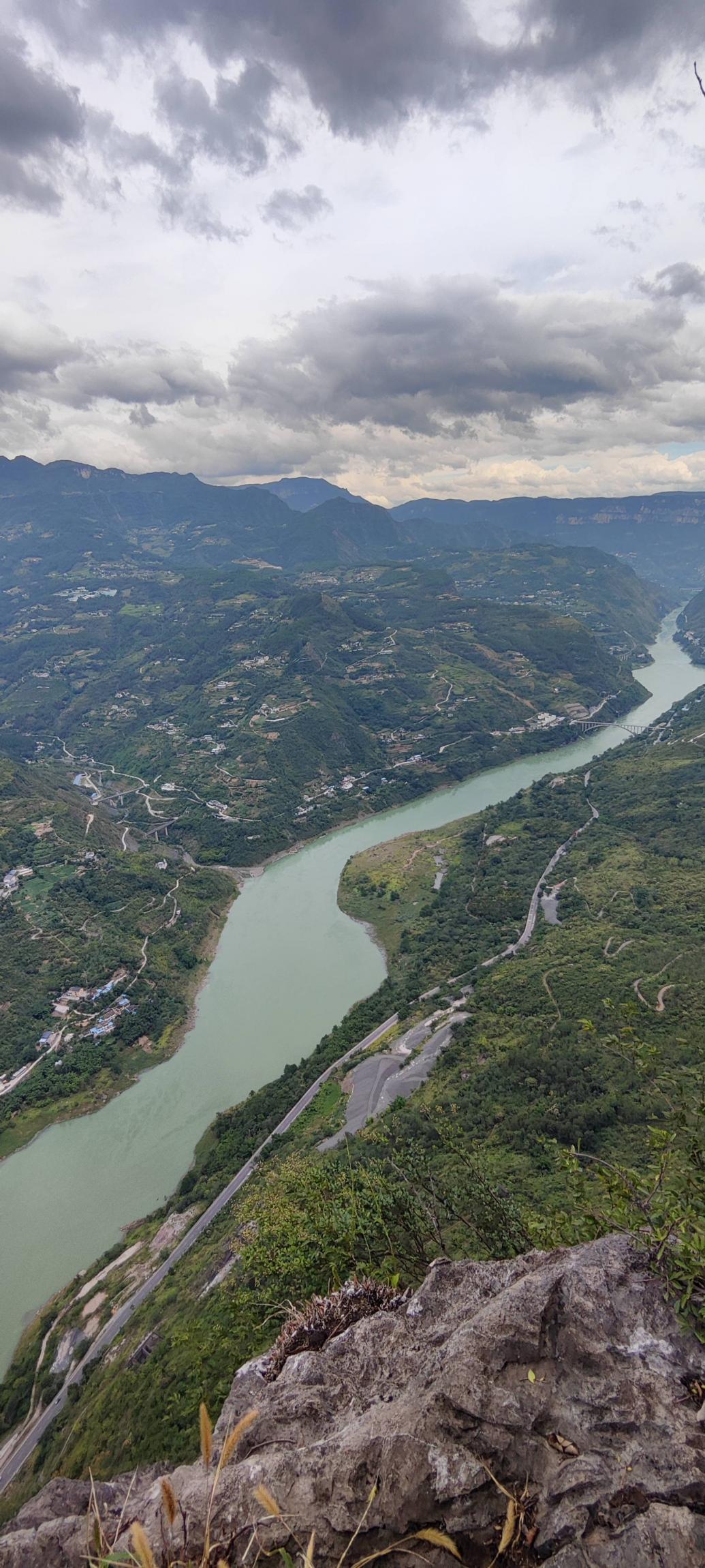 眼望右前方,快速前行。突然,右边一处比较亮堂,我拐进几米,一下子惊呆了,“仰观宇宙之大,俯察品类之盛。”,原来这就是网传中的白马悬壁。站在悬崖峭壁之上,云端极目,山河入怀。碧绿如翡翠的乌江在千山万壑间龙飞凤舞,换个角度,她又仿佛大地裂开的一条绿色缝隙。飞架两岸及峡谷的桥梁如彩虹跨越,蜿蜒的公路如丝带缠绕山间。城镇在眼里微缩成盘。对岸山峰如剑,绝壁千仞,像天地断痕,又似古老城墙,亦如白玉屏风。近旁的垂直悬崖,灰白的岩壁上点缀着倔强的绿植。穷尽乌江的远山,在云雾中若隐若现。此刻,所有疲惫都化成了风,美是世间治愈一切的良药。