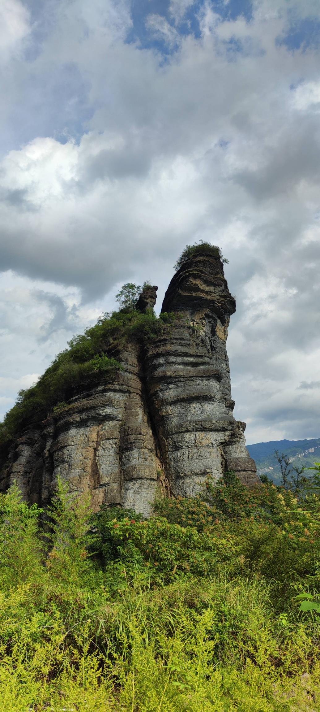 累了,坐石头上歇息,观层峦耸翠,或臆想圆孔之缘。经观音洞(悬崖绝壁上的一个山洞,古庙遗址,武隆文物保护之一)下至一碎石堆放处,然后下山。