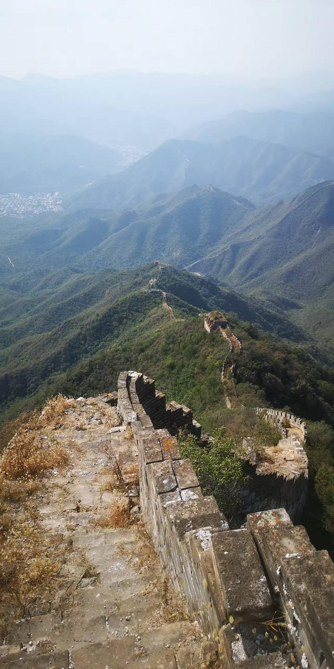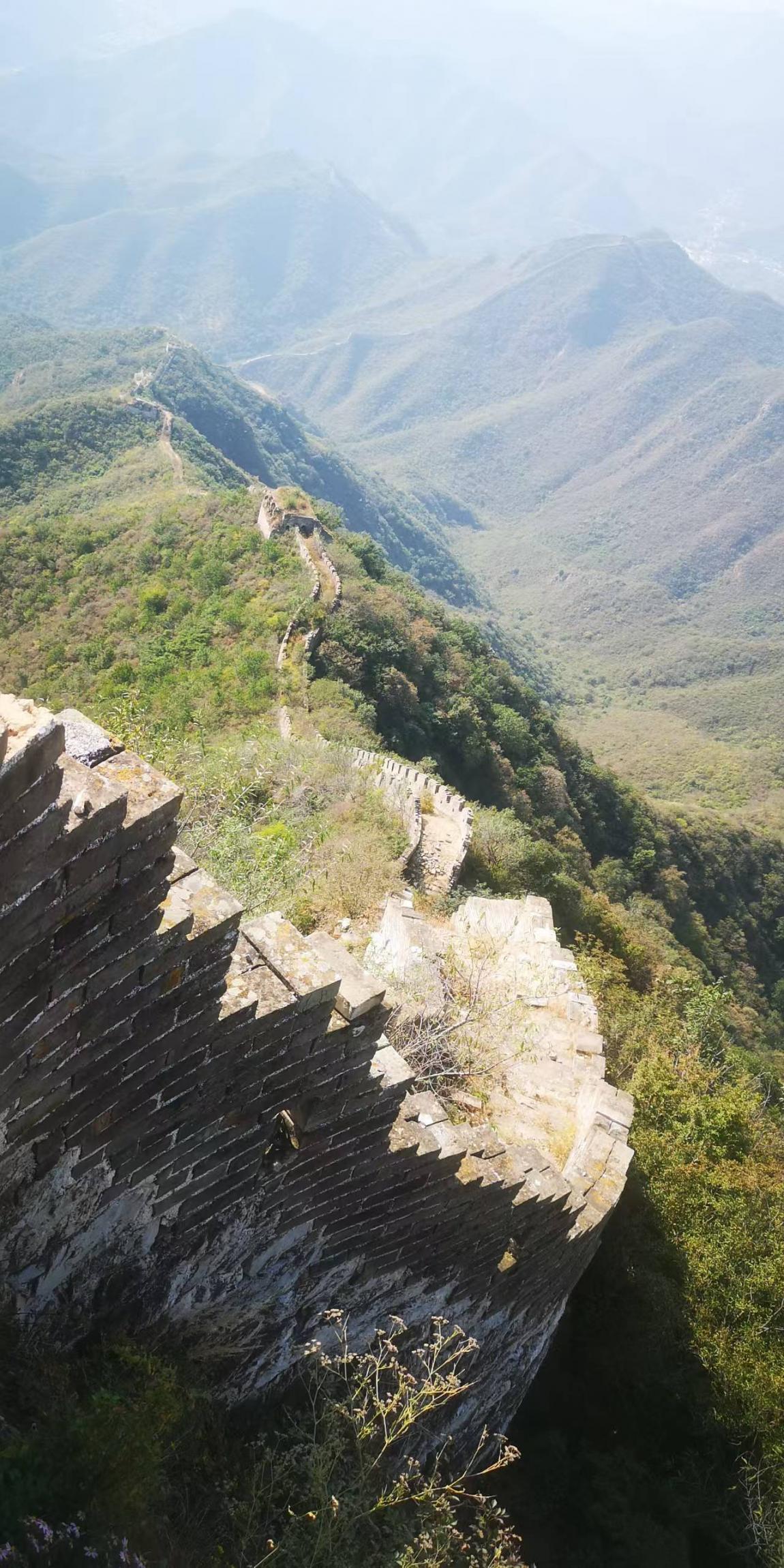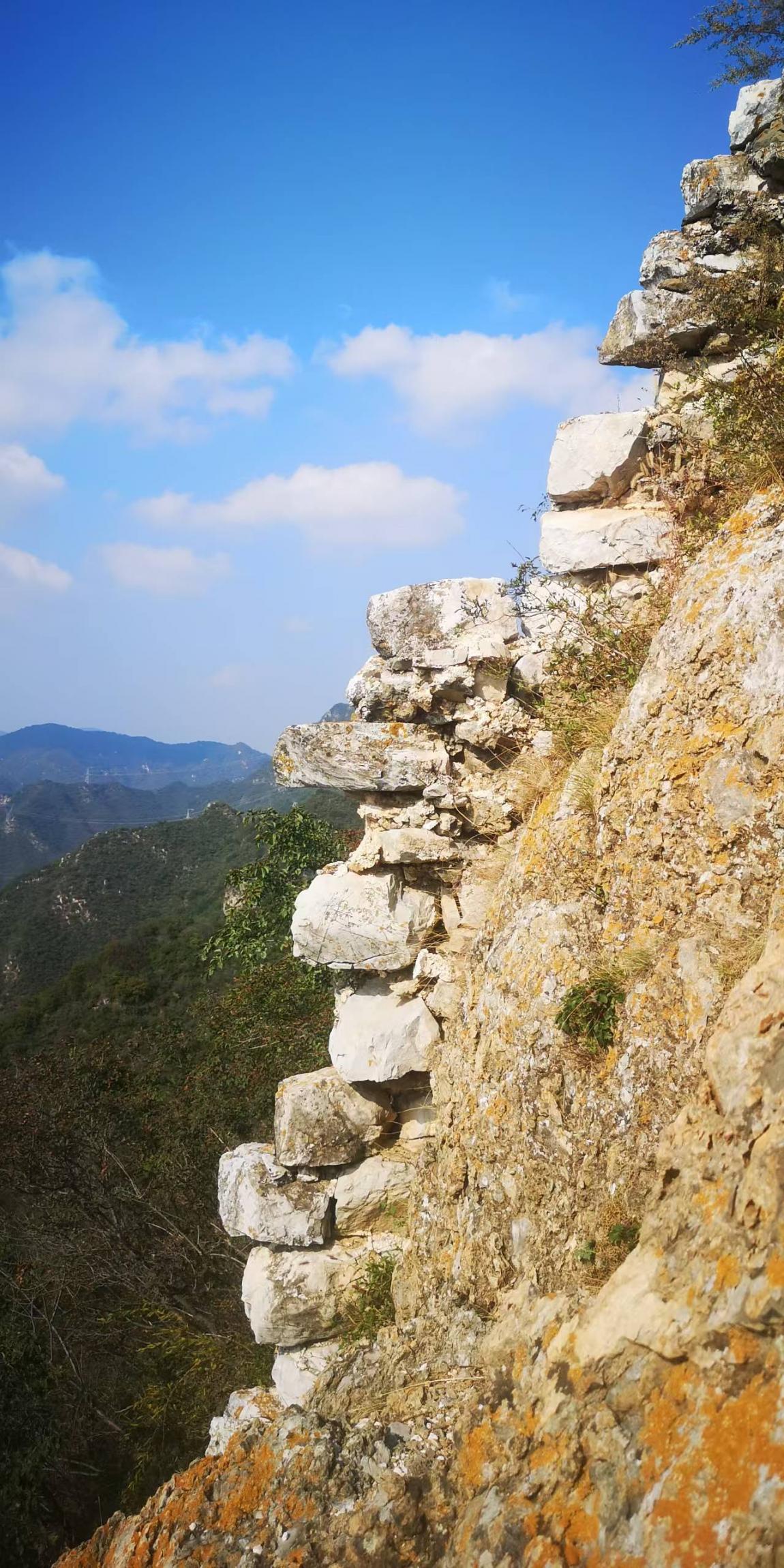 但是城墙下降的困难完全超乎我的记忆,说实话我记忆里都没有下降的过程,完全被忽略掉了。遇到第一个陡峭的贴墙壁下降,我整理好背包,小心地倒退着从窄窄的墙砖上挨下来,惊魂未定,就是一个接一个的陡峭下降,直到一大段砖墙下裸露的80度岩壁,我开始怀疑十几年前是不是真从这里下去过。这看上去就是一座10米高的攀岩墙,如果走过这里,我应该绝对不会忘的。所以我怀疑是这些年的风雨侵蚀,这一段墙砖全部脱落了。