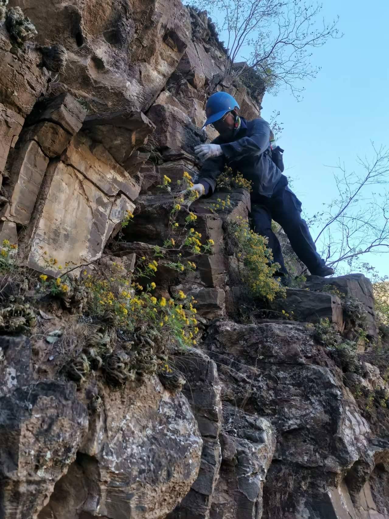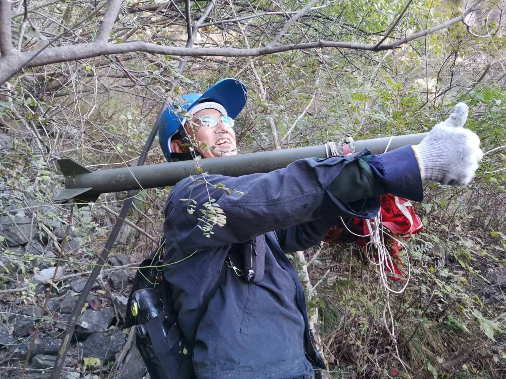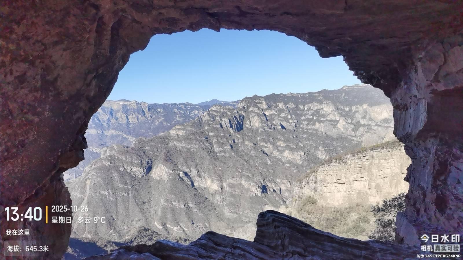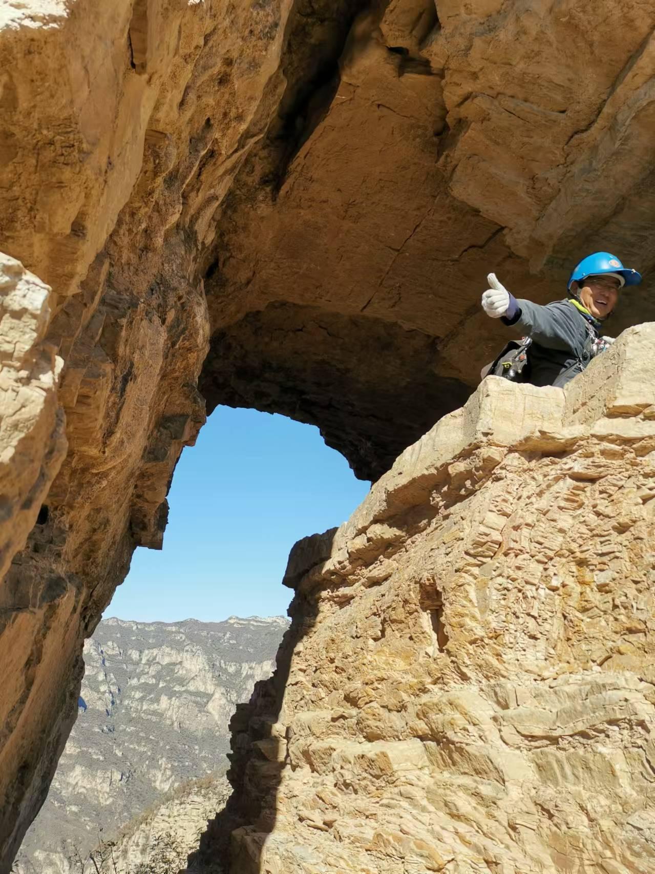 窟窿洞本是一条非常成熟的路线,由于北线沟起始端梯田不断,为了探寻状况直走崖根,回绕走灌木发现驱雹火箭筒空壳,还发现有一个高10米阴洞,不太深没有近前。