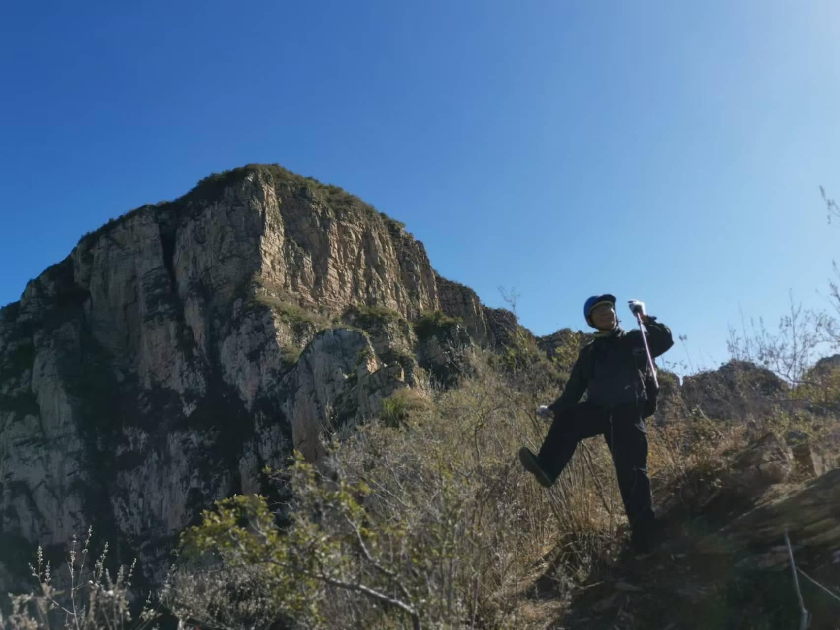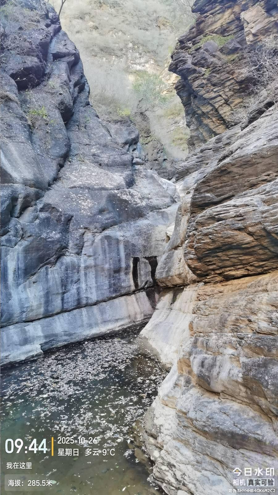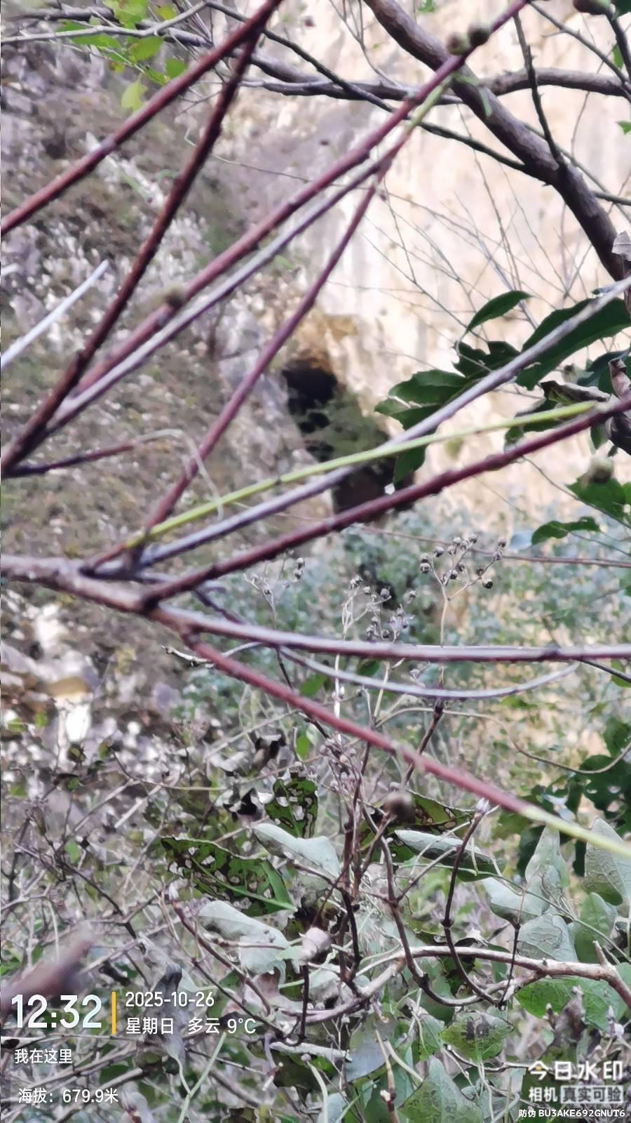 下山路走到折返岔路继续顺脊前行,走了一条法兰小路 。前三分之二有路迹,后面都是灌木,后来三面是崖,东侧黑乎乎看不见底,北侧挺陡有75度看不见底,西侧有沟,用绳子下去,越走越陡,最少50米斜滑坡和断崖,无法处理,于是回到垭口,继续寻找北侧唯一线索,走到崖头发现有横向断层突出,也就是20厘米宽度且朝东侧微下降,有灌木抓手 ,之后有螺旋兽道,有可攀下去的阶梯崖壁,之后一片灌木之后就是梯田和柿子树废屋,还有一口井,井是一个直径约30厘米的铁管子,安装在沟里高出地面一米多,法兰测算一下念叨某公式说有20多米深,他说听到回音2秒钟,我听是1.7秒。