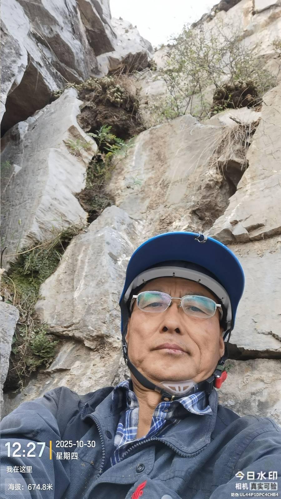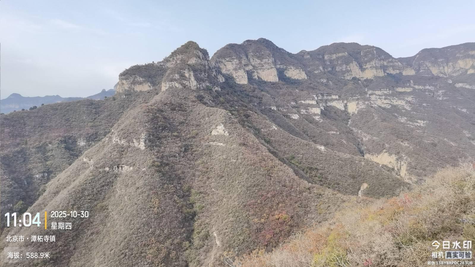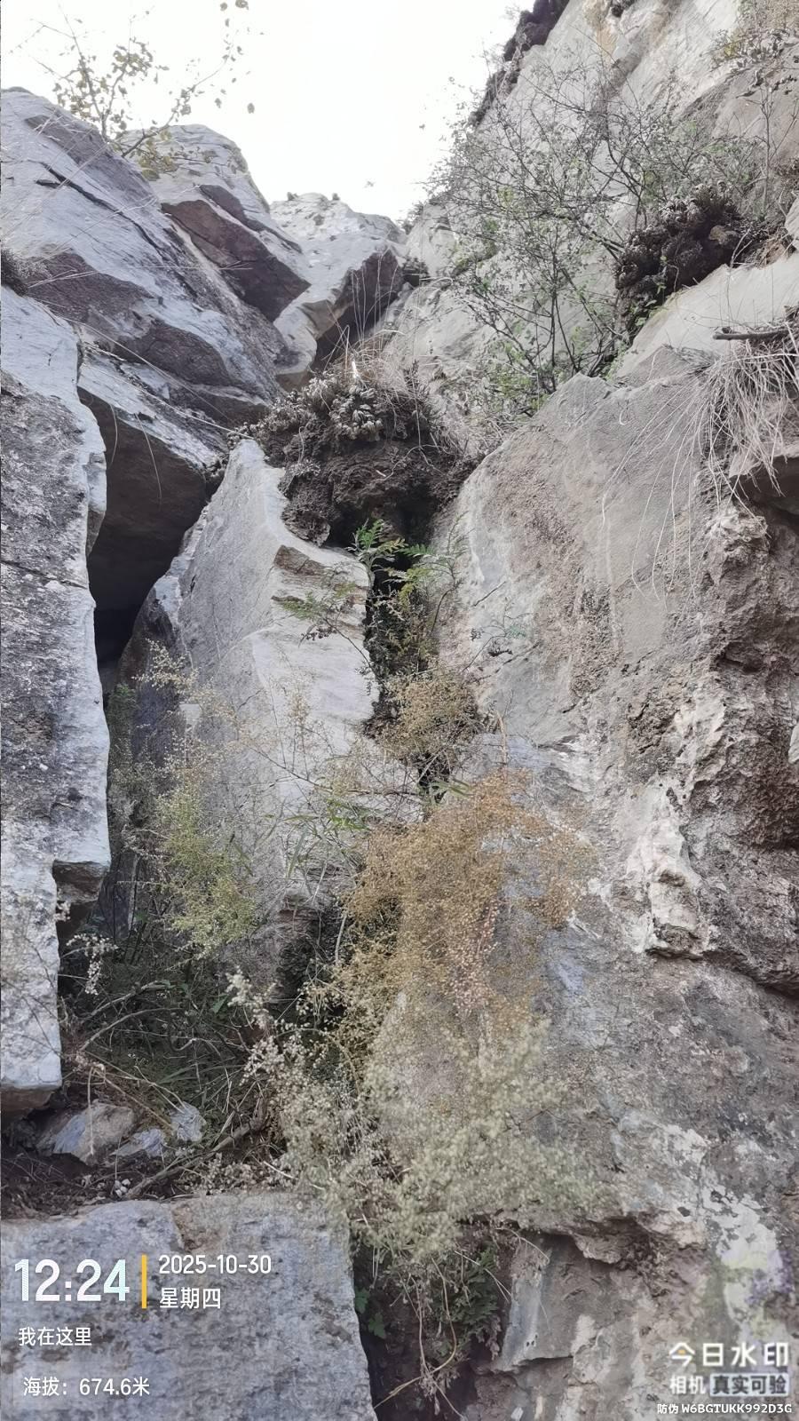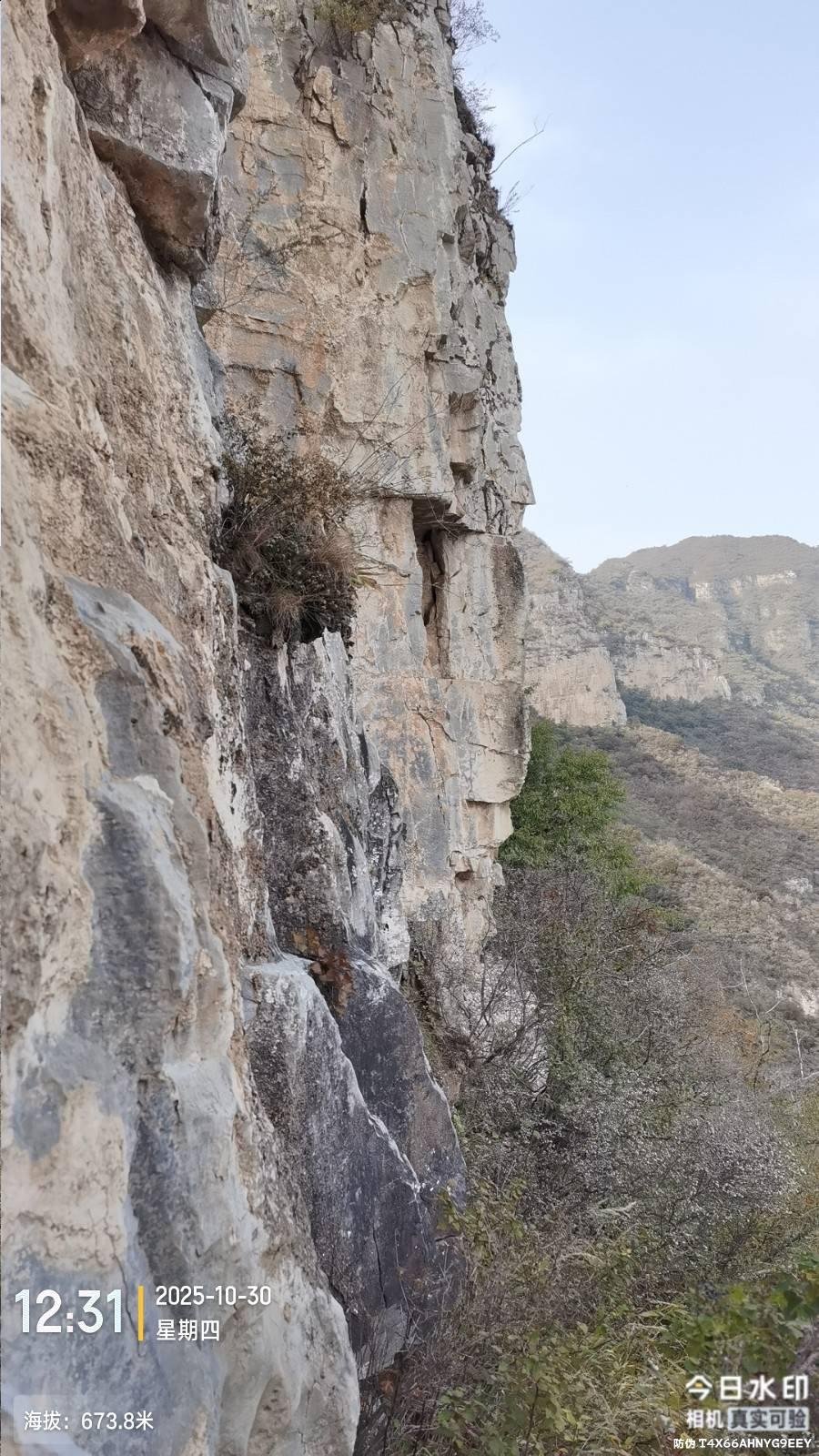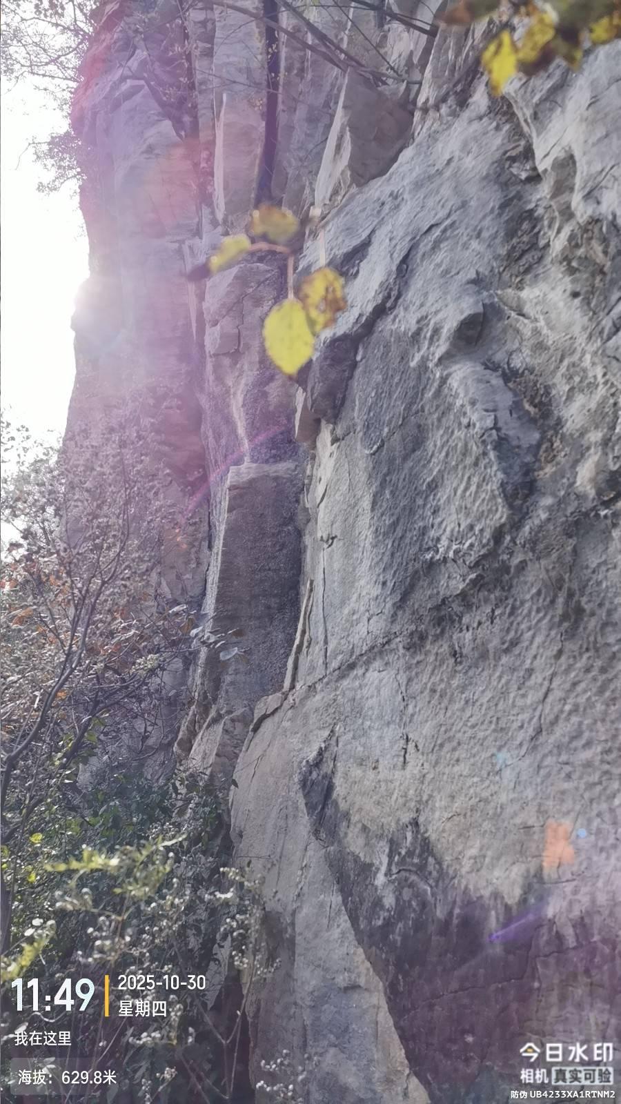 今天948路开的快,8:23就到东港村公交站。老周今天还没到岗,9:30走到上山点。走了一段蜉蝣路,快到崖时右转走崖北侧斜穿有个地方可以上崖就到了对过脊,这还走高了,又顺着脊朝西北侧下脊。