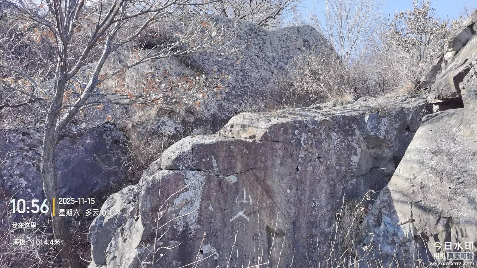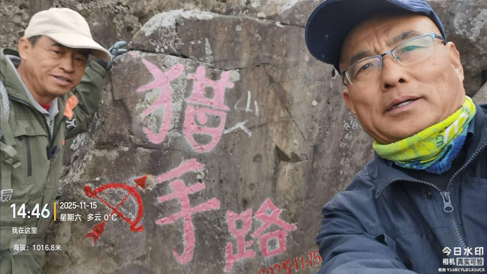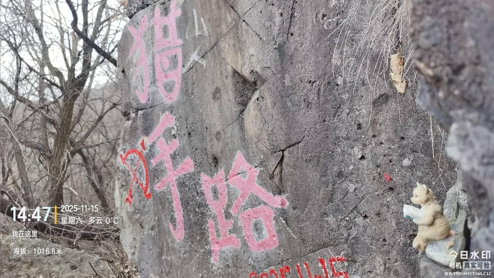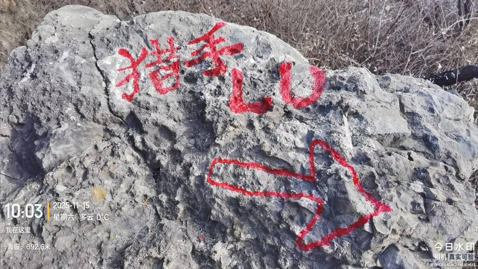 6:55猎手开车到北安河西口公交站接上我,7:05到了管家岭防火站栏杆处广场。8:33到窝棚处核实了猎手路起点,在东侧大石头刻了虚空箭头和“猎手LU”字样,用时75分钟。
