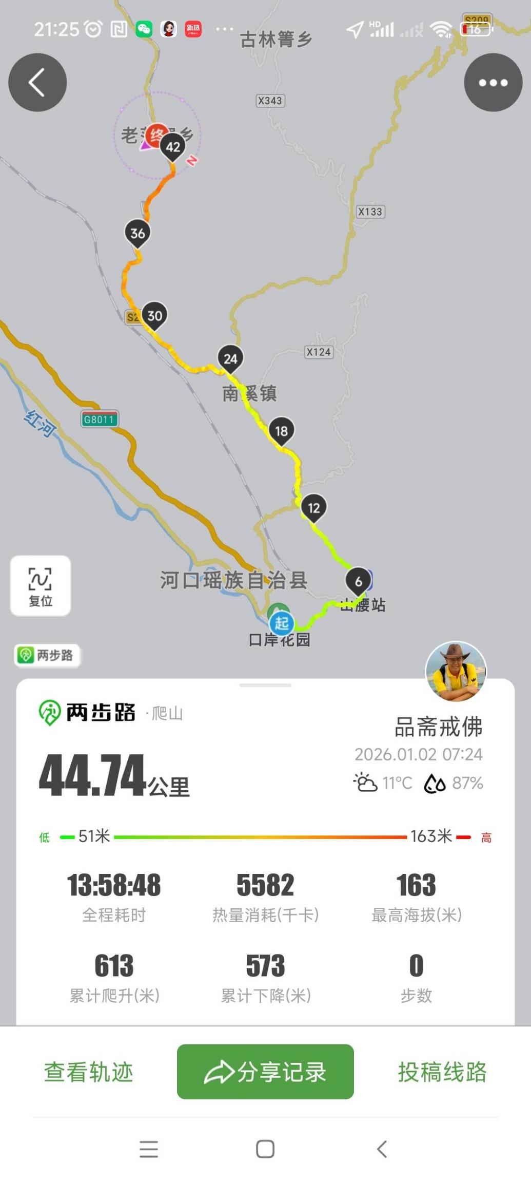 这颠覆的体悟,伴随我走过南溪河风景区最后的画廊。河谷收窄,水声激越,铁轨在高处峭壁上凿出窄径,人类工程的伟力与自然的险峻在此短兵相接,达成另一种惊心动魄的和谐。晚上九点多终于抵达老范寨,累计徒步44.74公里,累计爬升615米,化作腿脚真实的酸痛。