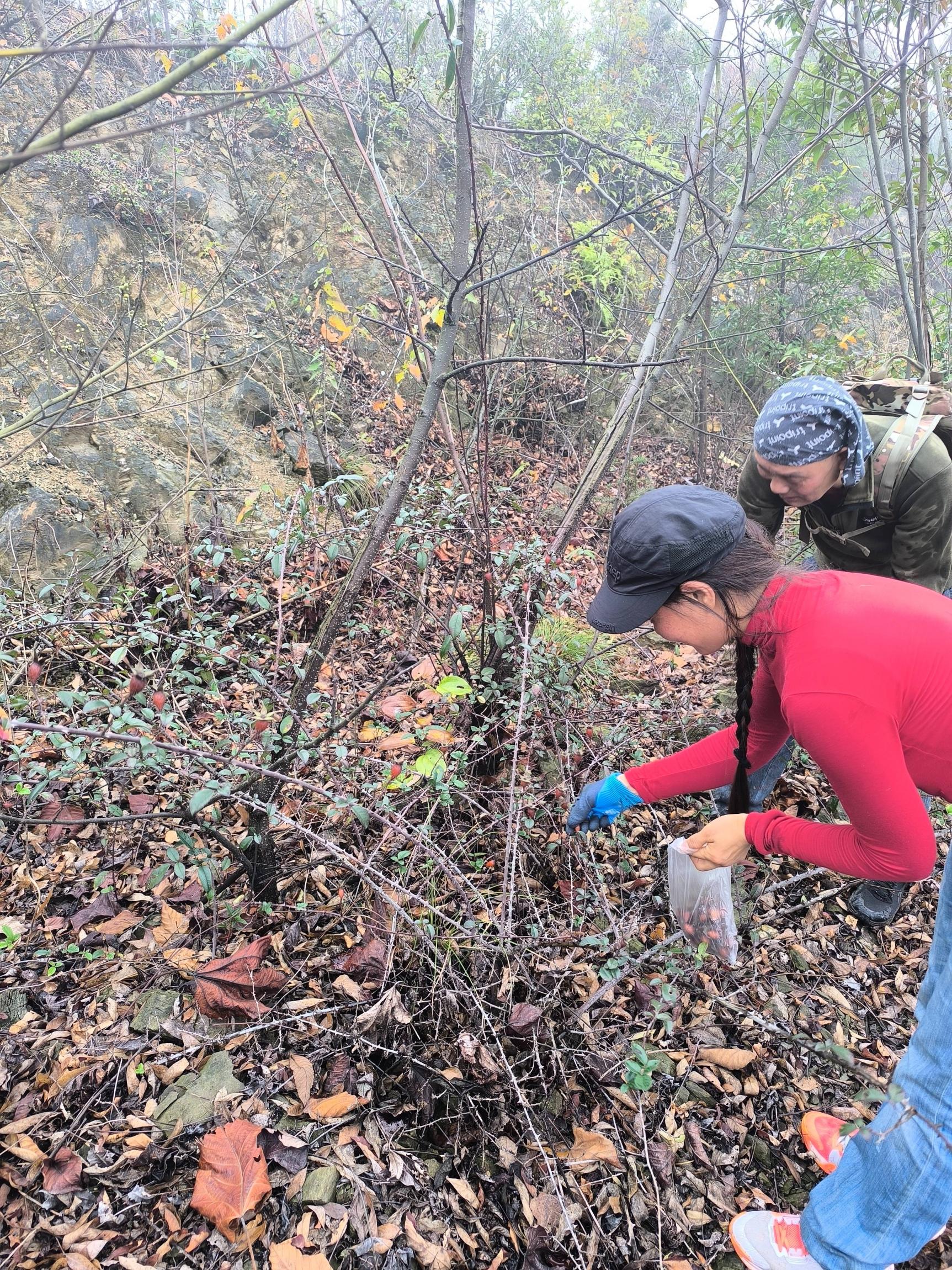 一处摘一袋,三处心满意足。有一处就四颗金樱子,藤蔓强壮果子肥大,感谢大自然的馈赠。开题人一路往前,彻道者垫底观望糖罐子,我们走中间。听到后面呼喊,叫稻草人来帮忙。啥情况,我们不可以帮忙?问题大了,猜想被夹了!四人聚拢,先看看,不急,拍照视频,记录难得一遇的状况。一只不锈钢捕猎器一头拴在树下,铁锈圆圈捕猎夹埋在路中间,守株待兔吗?我们三人走前面过去了,后面的大朱夹住了脚,先把脚拿出来,脱掉鞋子,不然动一下就会被夹紧一次。冷静,猎人如何取猎物,巧取不可蛮夺,头间扭转螺丝,夹子弹簧打开解扣,幸好时间短,抓扣浅,无碍。下个坡就是狗窝里水泥路,见到马路松了一口气,林子钻完了!