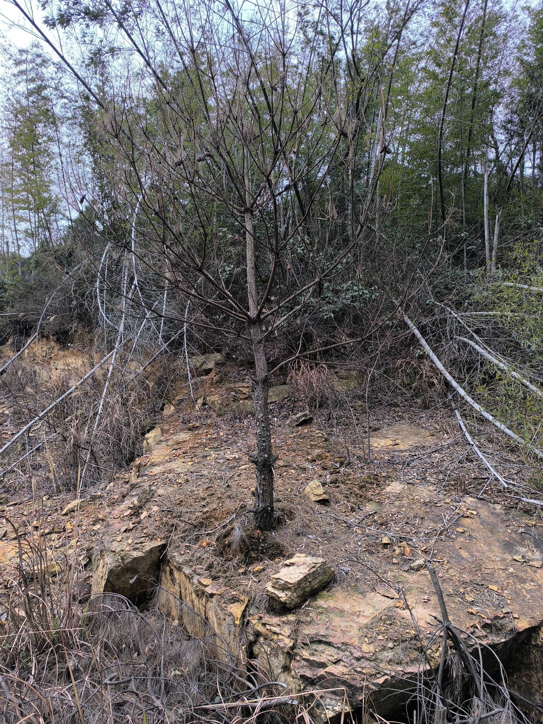 一股说不出的诡异感笼罩下来,我只想立刻逃离。正要拔腿跑时,瞥见石碑左边是一棵干枯的松树,直愣愣长在石头上,显得十分突兀;右边竟是一棵桃花树,在荒山野岭中孤零零立着,枝干光秃秃的。