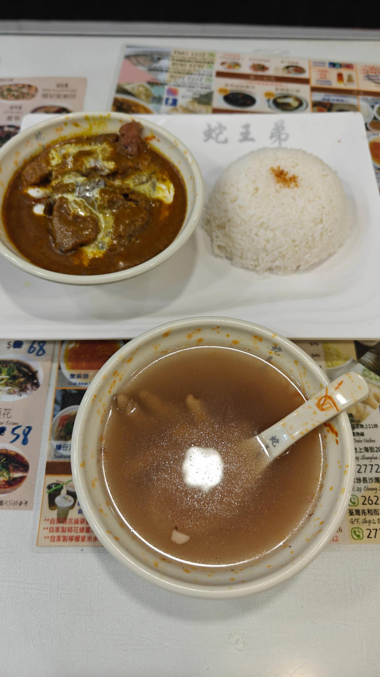 翻看甲亢哥的视频,我们坐的是同一个位置,但是我不敢吃他点的蛇羹,点了一个保守的咖喱牛肉饭。鸡脚汤也是在广东常喝的汤,香港的滋味会更浓稠。这个套餐一共是53港币,人民币大概46块钱。但是我想说,这个咖喱非常浓稠,椰奶味道也很浓,满满一碗肉,我得在肉里面仔细寻找土豆在哪里。这点和我在内地吃饭的感受是相反的,虽然便宜,但是咖喱味道很淡,是黄色,要使劲在不多的土豆里面找更加不多的肉。牛肉的品质也很好。我努力把所有的食物都吃完了。非常满足,饱腹感很强。