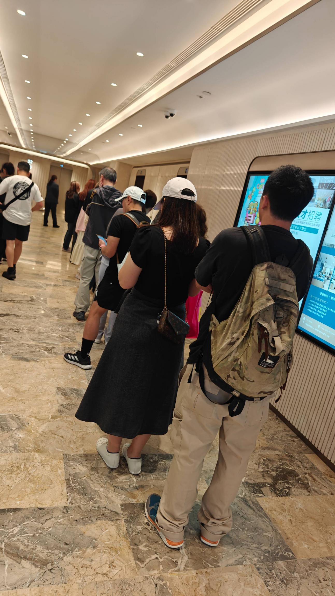 猜猜下面的人在干什么?他们在排队等电梯。三个电梯只排一条队伍,队伍里的基本上都是香港人,零零散散到处站的就是大陆人。