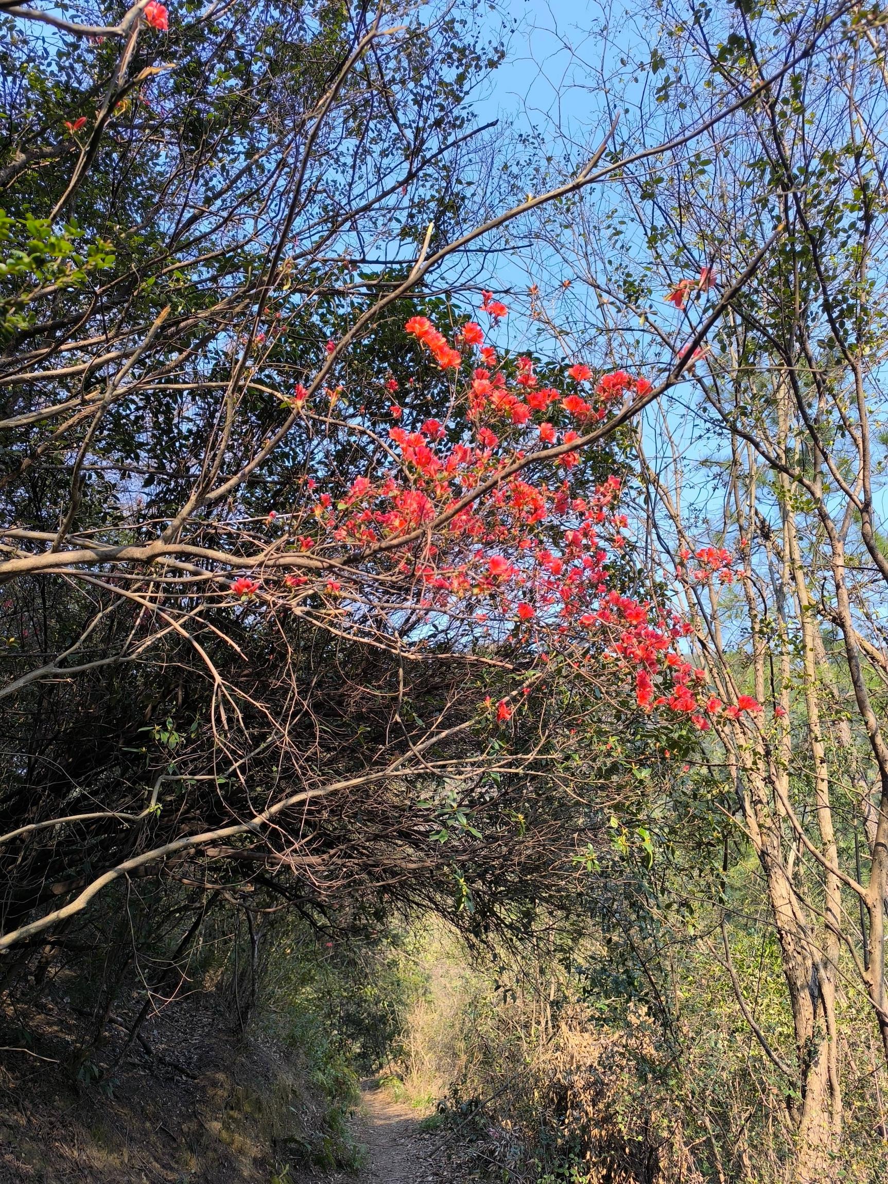 沿着洞阳水库旁的小路前行,转过一道弯,一树映山红横在眼前,热烈奔放,宛如燃烧的火焰,柳暗花明的惊喜,让人驻足。