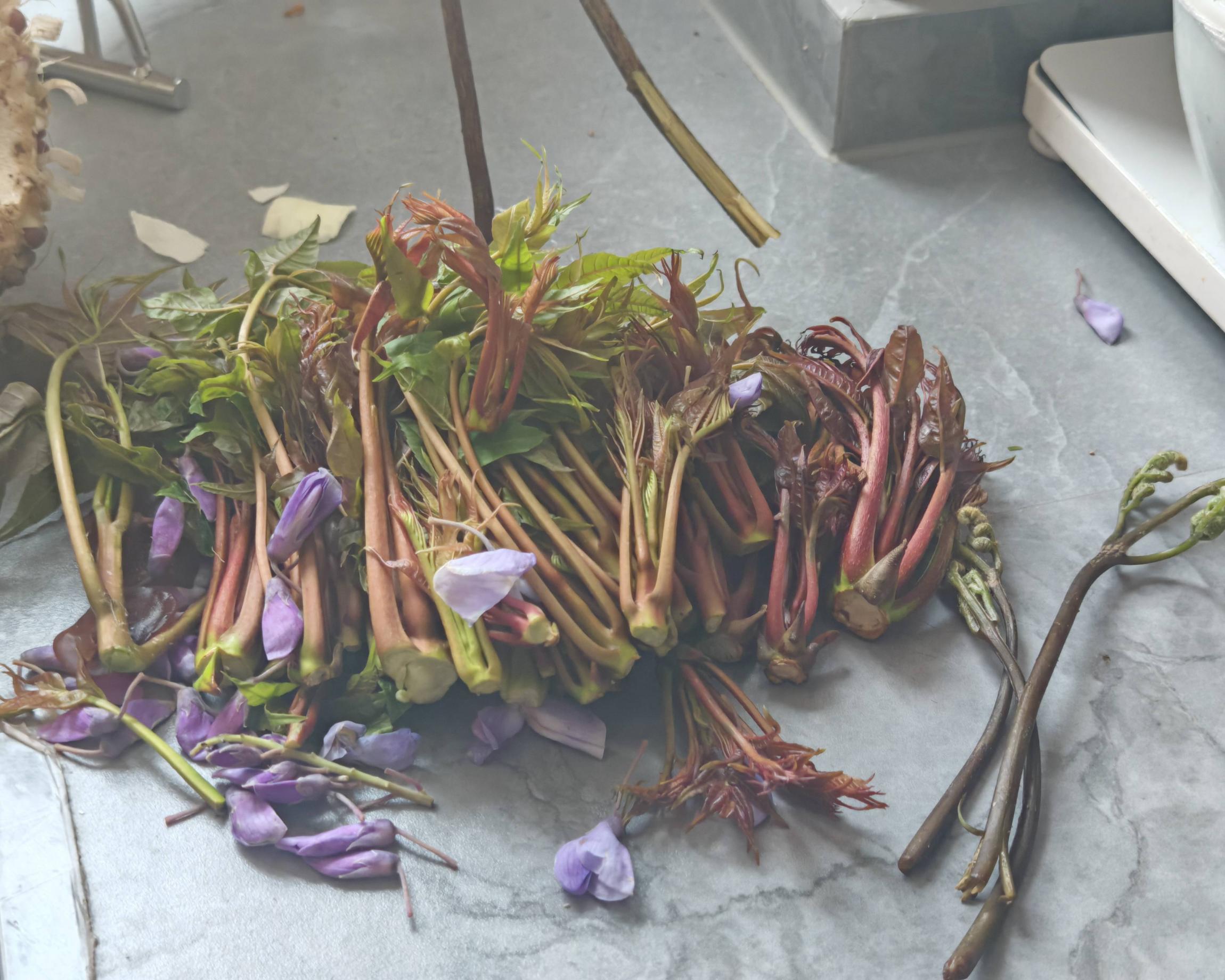 晚餐木耳汤、凉拌香椿、紫藤花蕾煎蛋,一天的疲累和腿脚的酸痛,消弭在一桌春菜的清香里!